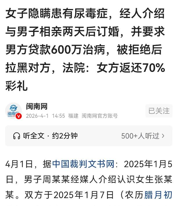 真坑人啊!河南周口,男子经媒人介绍与一女子认识,只2天,就按女方要求给了188000元彩礼,加三金和50000元的车,一共花了238000元。两人就闪婚办理了婚礼,但未领结婚证。谁知,两人住在一起后,男子才发现女子患有尿毒症。可女子不仅不觉得愧疚,反倒让男子去贷款600万为她治病。 男子傻眼了:她不仅欺骗了自己还想拿自己当冤大头!他提出分手并要求退还彩礼。女子说不可能,然后将他拉黑!女男子怒将女子诉至法庭,要求退还彩礼,法院判决意想不到 太康县法院判决书下来那天,周明(化名)手里攥着16.66万现金,指节都攥白了。这数字听着吉利,可对他来说,每一张都是从23.8万血汗钱里扒出来的,整整熬了一年官司才到手。 你说这事儿冤不冤?相亲两天就给了18.8万彩礼,加三金和5万车款,总共花了23.8万,结果娶回家个尿毒症患者,还张口就要600万贷款治病。更气人的是,最后法院只判退七成,剩下三成直接打了水漂,理由是“同居了三个月”。 这事儿得从2025年1月5号说起,河南周口太康县的周明经媒人介绍,认识了张莉(化名)。周明年纪不小,家里催得紧,两人见面聊得还行,媒人又在旁边撺掇,说女方条件不错,人也实在。 谁能想到,就这一面之缘,两天后腊月初八,两人就订了婚。按女方要求,周明一次性拿出18.8万彩礼,再加三金和5万车款,总共23.8万,眼都没眨一下。 1月25号,两人办了婚礼,热热闹闹请了亲戚朋友,可就是没领结婚证。周明当时还琢磨,先办婚礼再领证,也符合当地习俗,没多想。谁知道,同居没几天,他就发现不对劲了。 张莉每天都躲在卫生间里吃药,药瓶藏得严严实实,问她就说是普通保健品。后来周明才知道,那些都是治疗尿毒症的特效药,她这病都拖了一年多了,相亲那天全靠浓妆遮着脸,硬是没露出半点破绽。 纸包不住火,真相还是露了馅。周明质问张莉为啥隐瞒病情,她倒好,不仅没半点愧疚,反而理直气壮地让周明去贷款600万给她治病。 周明当时就傻眼了,这哪是结婚,分明是找了个无底洞啊。他当场拒绝,提出分手并要求退还彩礼。张莉一听就炸了,说退钱不可能,你爱咋咋地,第二天直接把周明拉黑,彻底失联。 周明没办法,只能把张莉告上法庭,要求退还全部23.8万彩礼。案子拖了整整一年,法院判决下来,让他彻底懵了。法院认为,张莉隐瞒重大疾病确实有错,但两人已经同居三个月,所以只判返还70%,也就是16.66万,剩下30%,差不多7万多,就这么没了。 这判决一出,网友们都炸锅了。有人说,这不明摆着欺负老实人吗?女方明显是骗婚,故意隐瞒重病,拿彩礼当救命钱,最后还能白得7万,这世道还有没有天理?也有人说,法院判决有法律依据,同居三个月确实会产生一些费用,适当扣除也合理。 我倒觉得,这事儿里有几个关键点得讲清楚。首先,张莉隐瞒尿毒症,这已经违反了《民法典》第1053条规定,一方患有重大疾病,应当在结婚登记前如实告知另一方。她这行为,不仅欺骗了周明的感情,更是剥夺了他的婚姻自主权,让他在不知情的情况下做出错误决定。 其次,两人没领结婚证,这婚约本身就不受法律保护,按最高法关于彩礼纠纷的规定,未办理结婚登记手续,彩礼应当返还。 最后,那“同居三个月”到底值不值7万多?周明是被骗同居,又不是自愿的,这损失凭啥让他一个人承担? 更让人揪心的是,张莉要求周明贷款600万治病,这简直是狮子大开口。要知道,尿毒症治疗费用极高,透析一次就要几千块,换肾更是动辄上百万,600万对普通家庭来说,就是天文数字。 她明知道周明拿不出这笔钱,还故意提这要求,说白了就是破罐子破摔,想把周明拖下水,自己捞不到好处也不让别人好过。 这事儿也给所有人提了个醒。相亲结婚,别太着急,多了解了解对方情况,婚检更是不能少,这不是不信任,是对自己负责,也是对别人负责。彩礼方面,量力而行,别打肿脸充胖子,更别因为家里催婚就草率决定,毕竟婚姻不是买卖,感情也不能用金钱衡量。