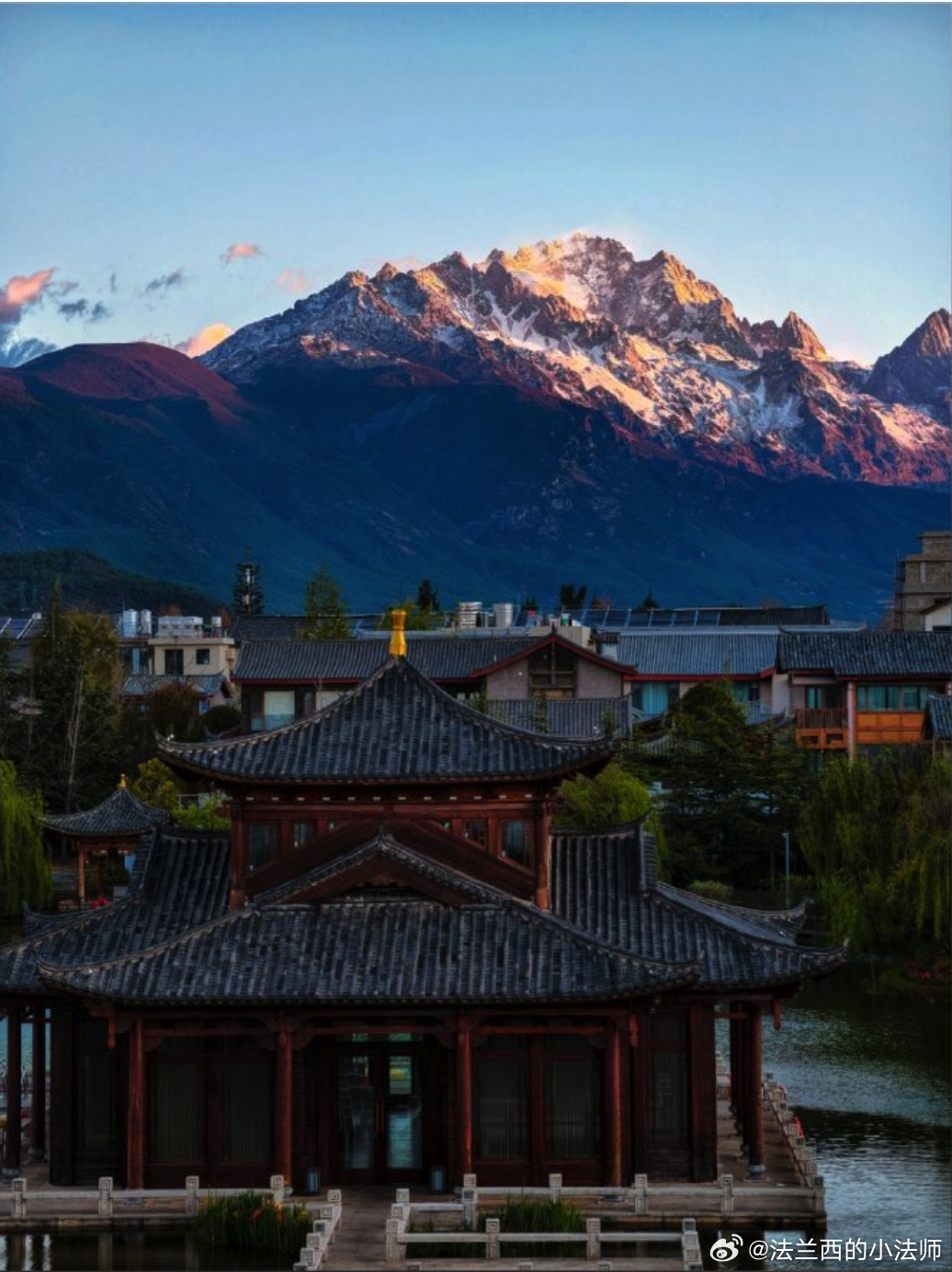 前几天在丽江住的那个金茂隐逸,闹中取静,位置很舒服,把传统和现代的亭台楼阁、少数民族特色建筑,还有水景、人文和自然环境很好地融合在了一起,而且拍日照金山绝对是非常棒的位置。