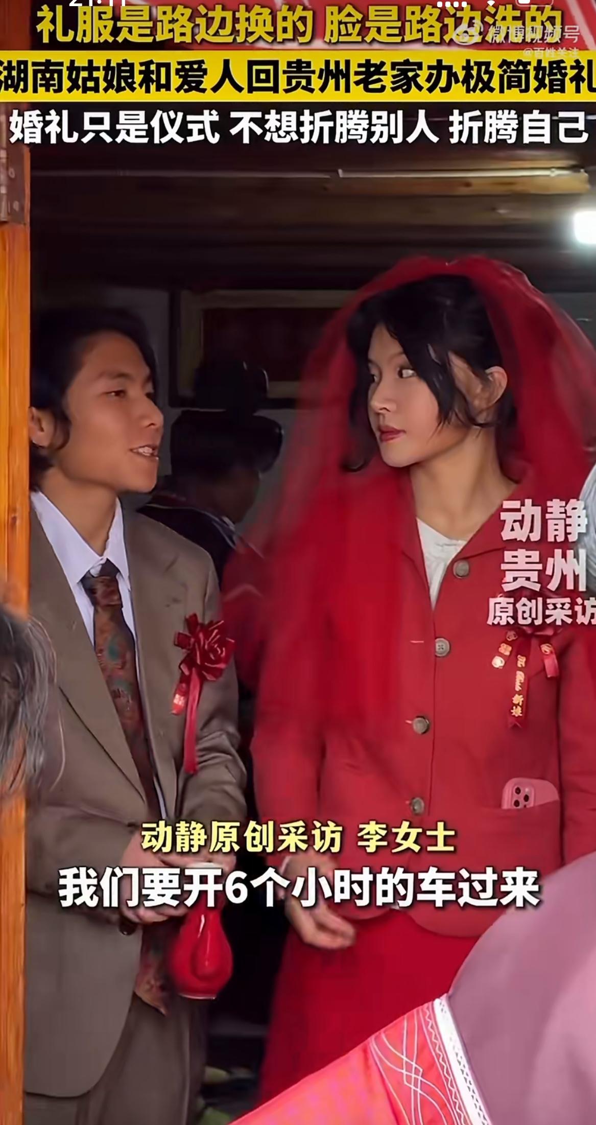 湖南姑娘李女士和她的贵州爱人。两人为了举办婚礼,特意开了六个小时的车回到男方老家,但这场婚礼却和很多人印象中的传统婚礼大不相同,没有豪华车队、没有专业司仪、也没有复杂的仪式环节,甚至连换礼服和洗脸都是在路边完成的。