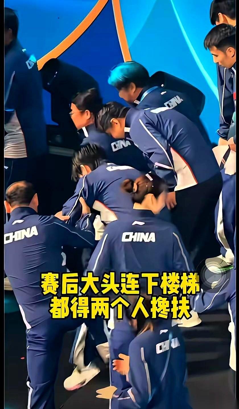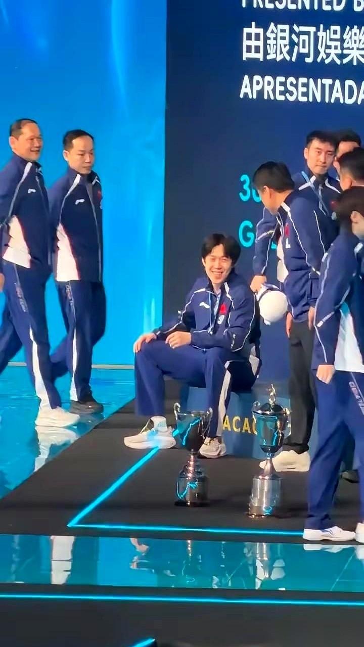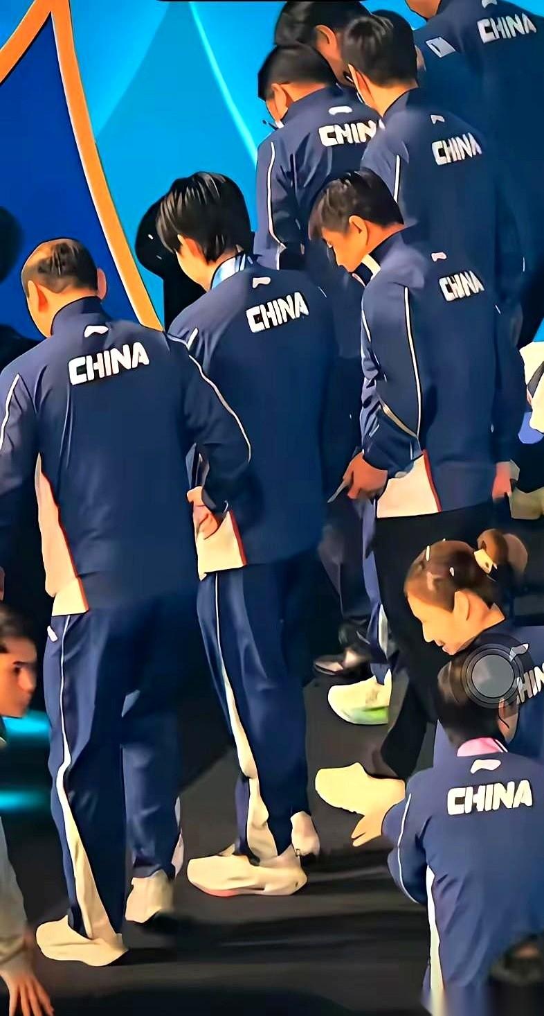 大合影,镜头前王楚钦举着金牌,镜头后,王皓指导的嘴就没停过,死死盯着他。