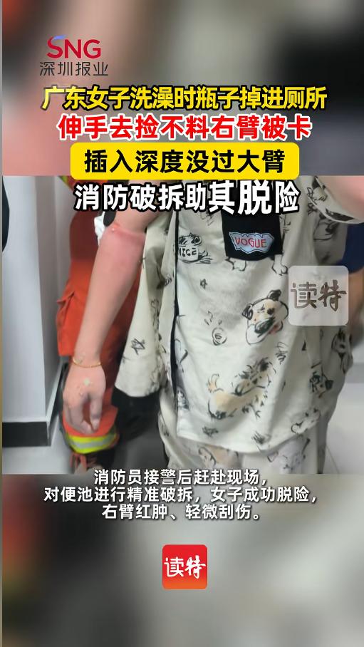 “这手还能要么?”3月31日,广东广州,一女子在公寓洗澡时,塑料瓶不小心掉进了蹲便池里,女子见状伸手就去捡,不成想手臂竟被卡在了洞里,一直卡到了大臂,最后还是消防员破拆给解救了出来。网友:怕是要腌入味了! 平时蹲厕所玩手机的时候,最怕的就是手机掉坑里,不知道该不该去捡。其实,不止是手机,任何东西掉便坑里,都千万不要下手去捡。 据媒体报道,事发当晚,该女子正在公寓里洗澡,结果一个塑料瓶掉进了便池里。女子担心堵上了,赶紧伸手就去捡。没想到,瓶子掉的有点深,女子够了一下没有够到,在想够时,发现自己的胳膊被卡住了,整个大臂几乎都伸进了厕所孔里。 这一下可尴尬了,女子想拔也拔不出来,卡的整个胳膊都红了。找人救援,也是怪难为情的。几次尝试之后,女子还是叫了消防救援。 消防员进场后,发现硬拔或者是使用润滑剂,都没有解救出来的可能性,最后选择了简单粗暴的方式,直接破拆便池。女子脱险之后,发现她的手臂只是有些轻微划伤,还有些红肿,并没有受太重的伤。 网友看后表示,这实在是太尴尬了,还好都不认识,不然以后可没法见人了!虽然伤不重,但还是建议去医院看看,毕竟卡的这个地方,细菌病毒实在太多,万一渗进去点,实在是太过危险! 信息来源:《广东女子洗澡时伸手捡塑料瓶,右臂被卡厕所孔洞,消防破拆救援》深圳新闻网