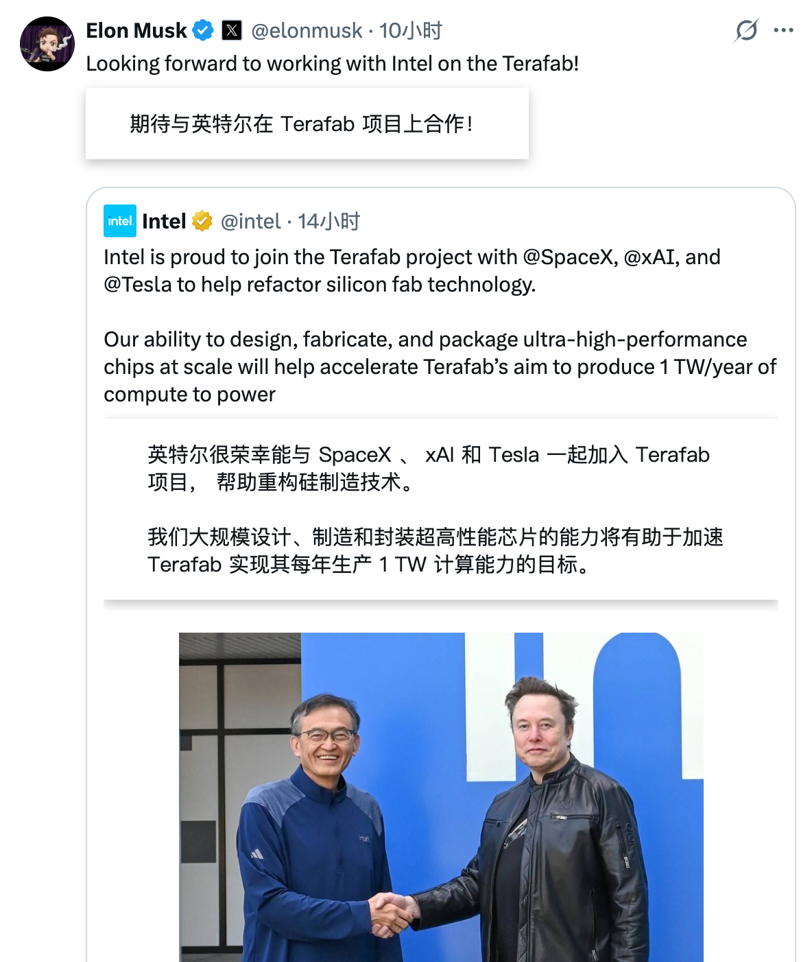 特斯拉、SpaceX 和 xAI 的旨在实现 1TW/年的 AI 芯片项目和 Intel 合作了。