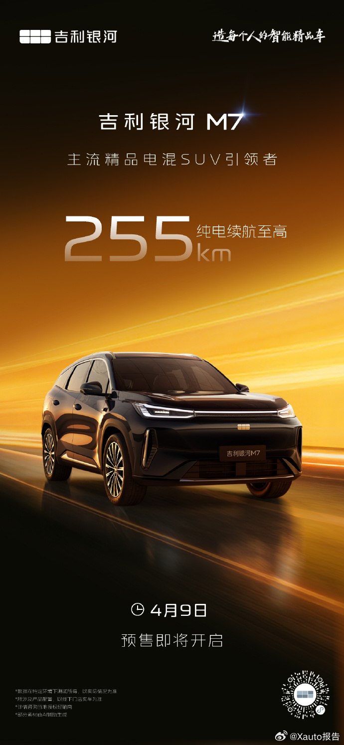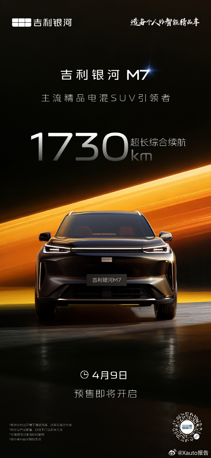 吉利银河M7 4月9日开启预售吉利银河M7定位主流精品电混SUV,主打引领美好生
