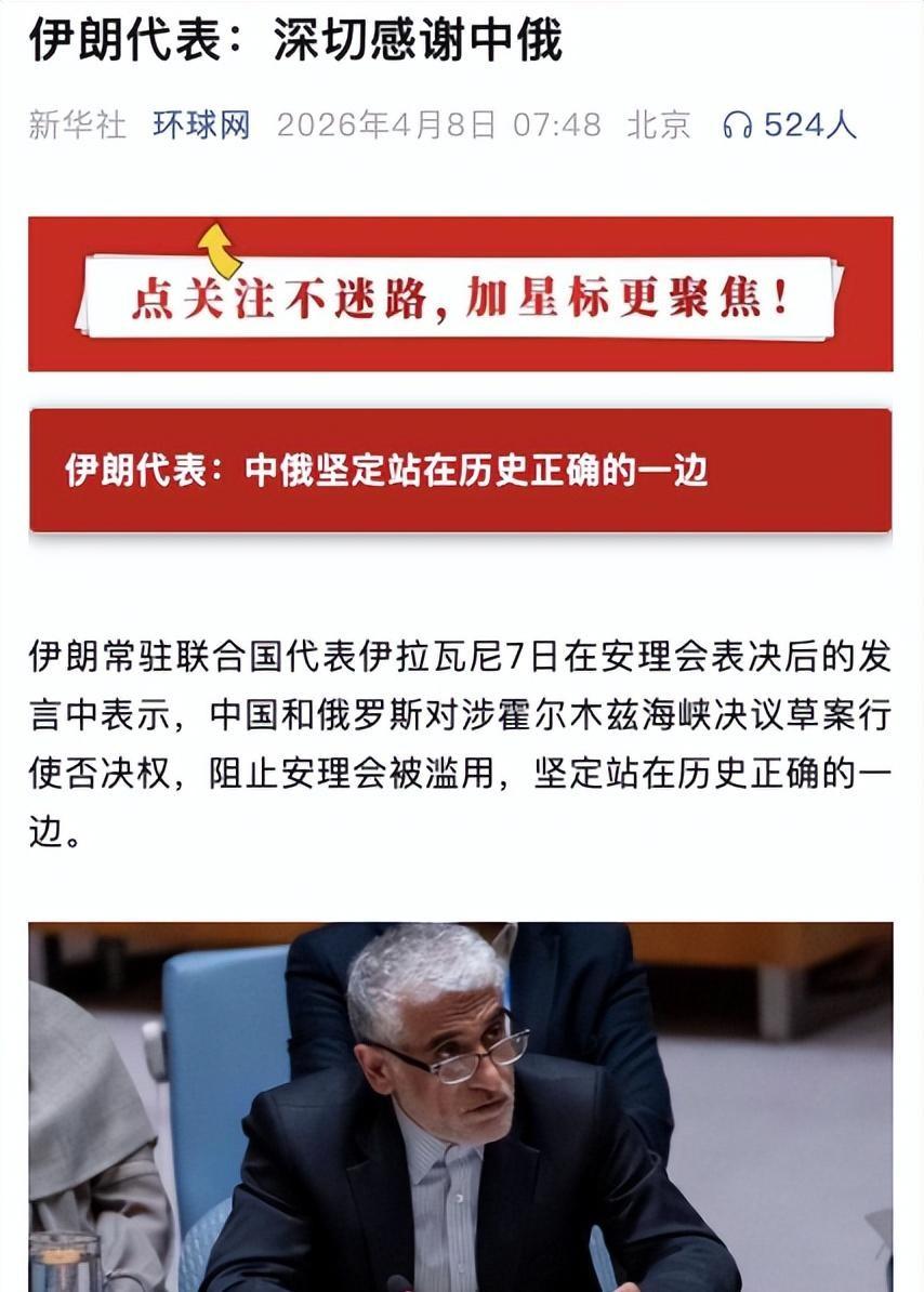 伊朗常驻联合国代表伊拉瓦尼说得很明白:中国和俄罗斯对涉霍尔木兹海峡决议草案行使否决权,阻止了安理会被滥用,坚定站在了历史正确的一边。