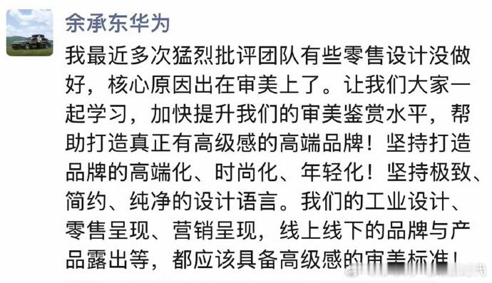 余承东猛批团队设计不高级余总直接给团队开了「审美强制补习班」了属于是!余承东最新朋友圈刷屏,直言多次猛烈批评团队,零售设计拉胯根源就是审美不行,不光要线下零售改,工业设计、营销呈现、线上线下所有品牌露出,全环节都要升级审美标准,主打一个全链路无死角微博。最绝的是还配了个《有钱就有审美了吗?》的帖子,一句话戳破真相:高端感真不是靠堆钱堆出来的,审美认知才是核心。以前总说理工男不懂审美,结果余总直接用行动证明,高端品牌的半条命,都是审美给的!连线下门店的一个桌子、一面墙都要抠细节,这波细节控真的拉满了。想问下大家,你们买产品会被品牌的设计审美影响吗?有没有哪个品牌的设计,一眼就让你觉得 “太有高级感了”?