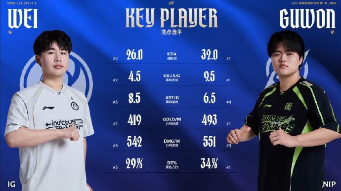 2026LPL第二赛段至今,WEI与Guwon数据对比。