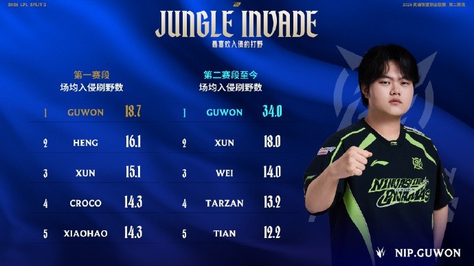 最喜欢入侵的打野:2026LPL第二赛段至今,Guwon第一赛段场均入侵刷野数为18.7,第二赛段至今场均入侵刷野数为34.0,均位列第一;