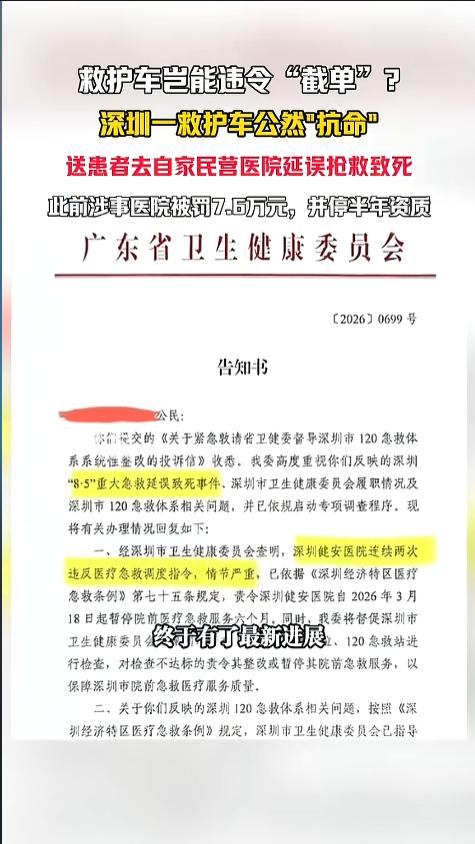 信息来源:《4月8日(发布)救护车岂能违令“截单”?深圳一救护车公然"抗命",送患者去自家民营医院延误抢救致死,此前涉事医院被罚7.6万元,并停半年资质。(编辑:小yu)》中安在线