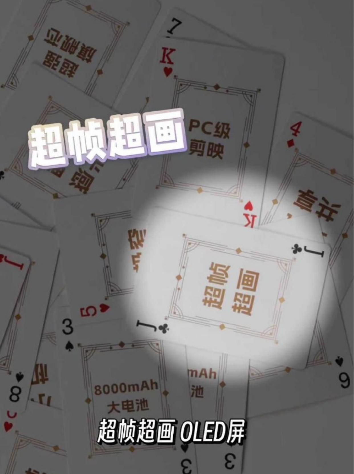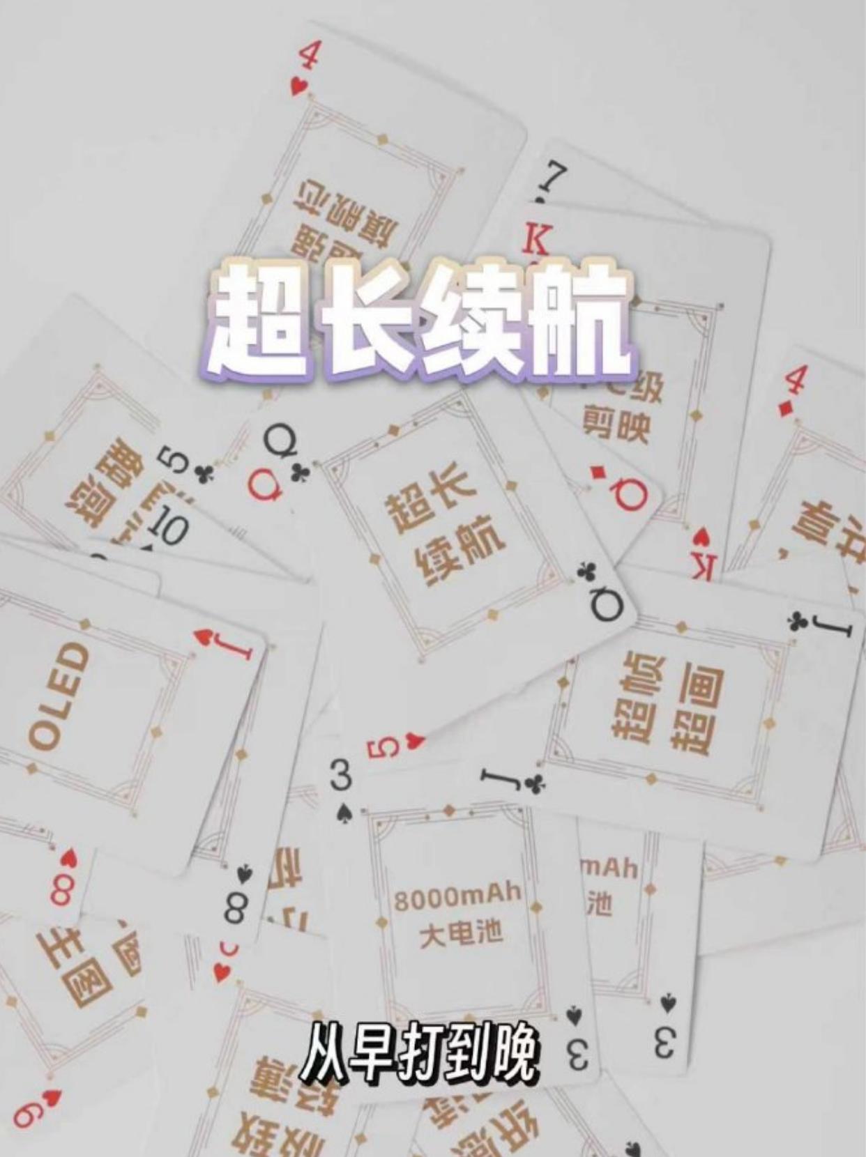 小平板背面是简约的胶囊型后摄模组,浅紫色配色。从桌上纸牌看有“OLED屏”、“8000mAh电池”、“旗舰芯片”等卖点,看来是要主打性能与精致感了,据说会是安卓首款全能板王级小平板,后面再等等看有啥新爆料??