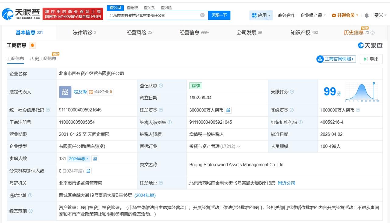 天眼查App显示,近日,北京市国有资产经营有限责任公司发生工商变更,注册资本由100亿人民币增至300亿人民币,增幅200%。