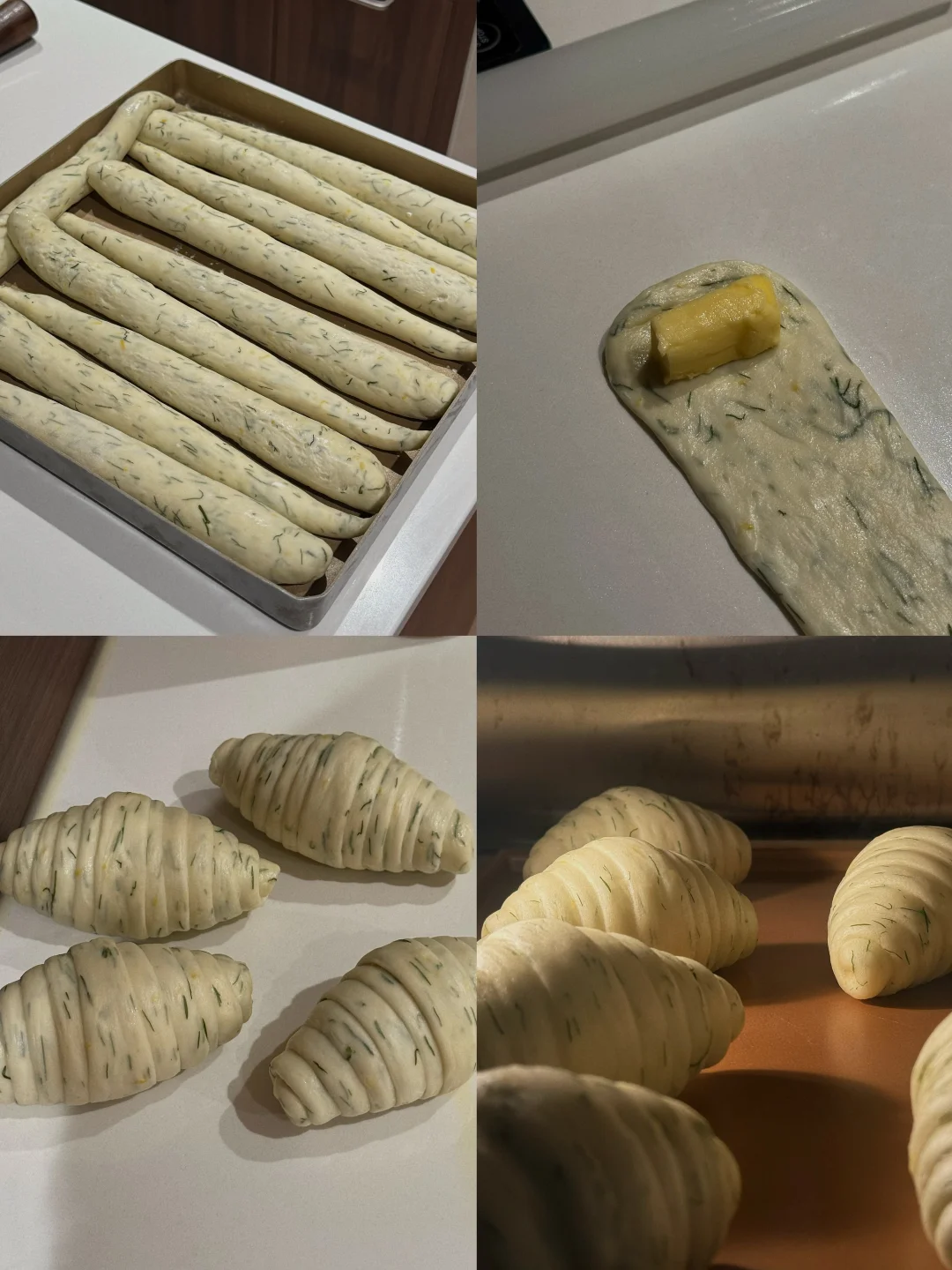 翻面,稍微再擀长,顶部放上黄油,两侧刷油