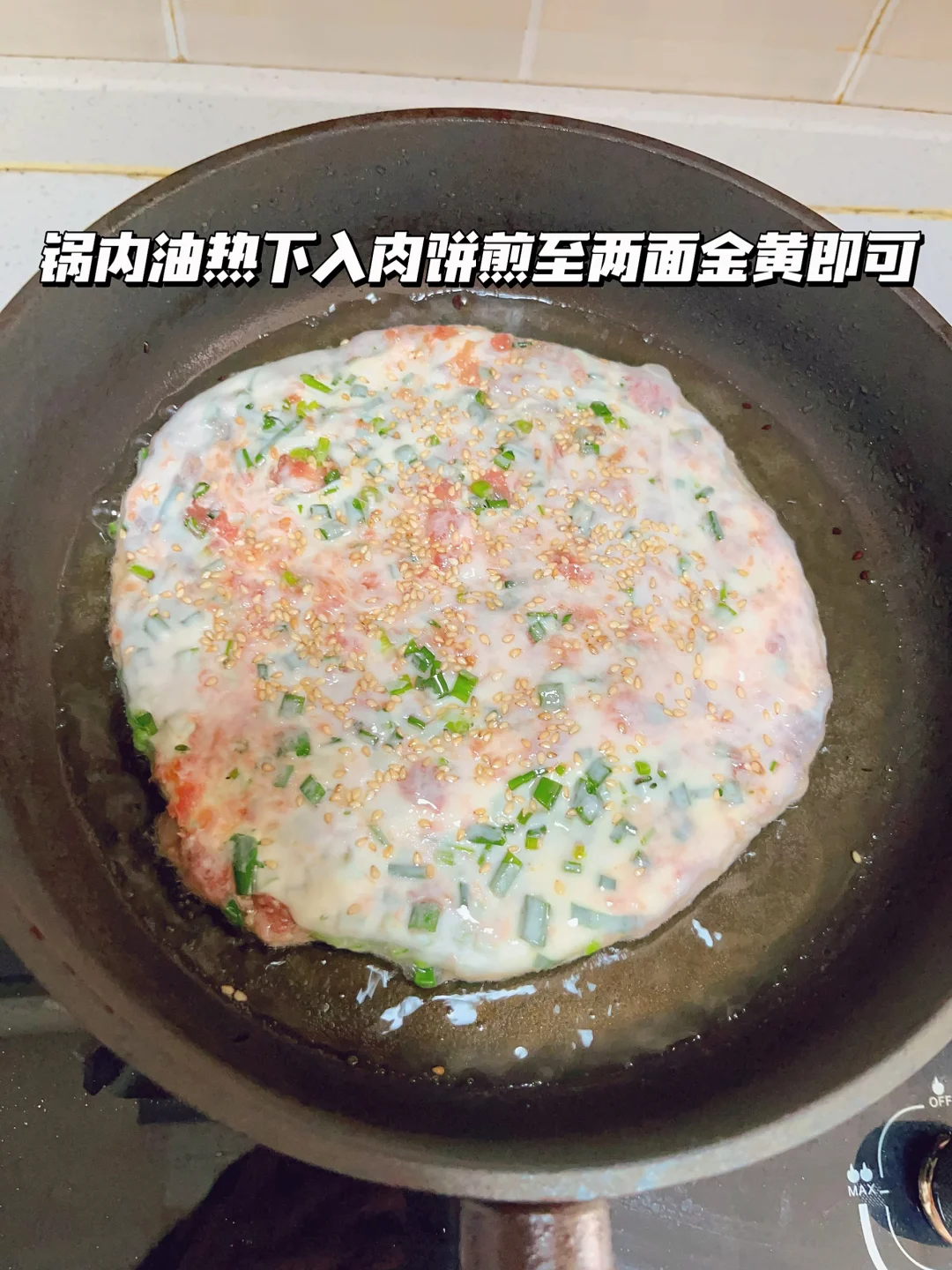 5⃣️肉饼擀成薄一点的饼状,油热下入饼子煎至两面金黄