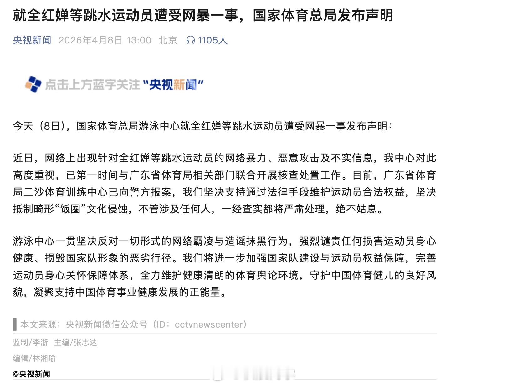 支持全红婵小妹妹报警。人家除了是奥运冠军,也是一个正值青春期的小女生,为什么要用恶毒的言语去人身攻击她?她在为国争光的时候,那些人围在她湛江老家直播,搞流量,现在又来网暴她的身材,赶紧把这些网暴的人抓起来才对。