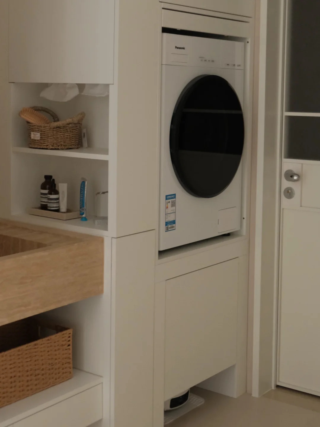 ▪️预留了洗衣机嵌入式位置,顶部做封闭柜、侧面做开放格,洗护用品、清洁工具全部有序收纳