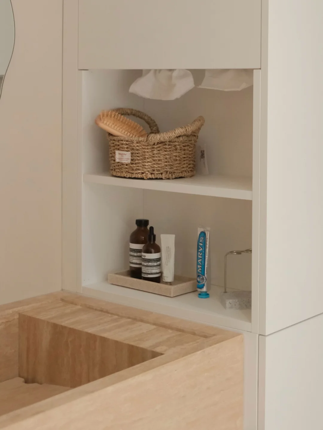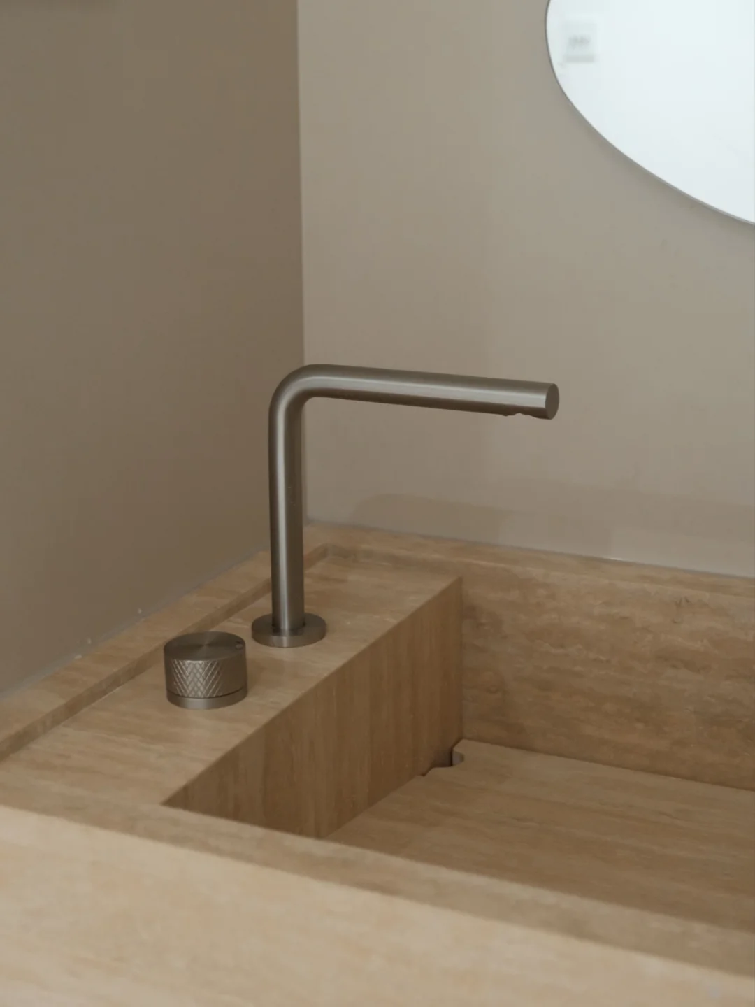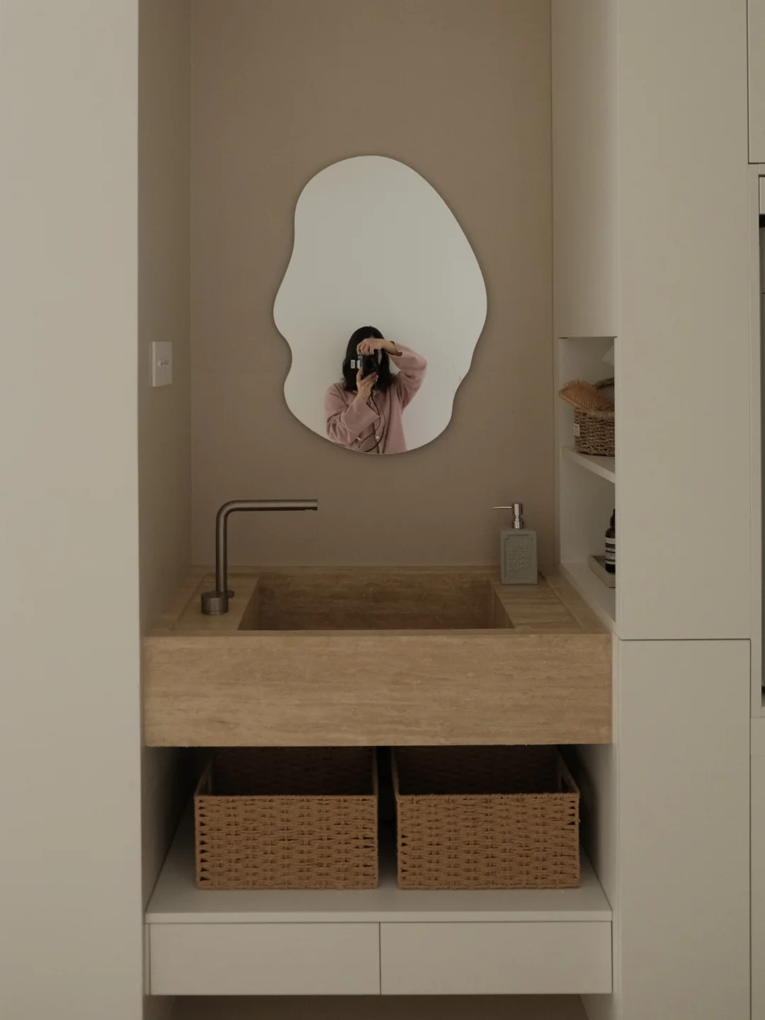 ▪️通体制成的悬浮台盆,保留了洞石自然的毛孔肌理,温润又自带侘寂质感,和奶油风完美适配