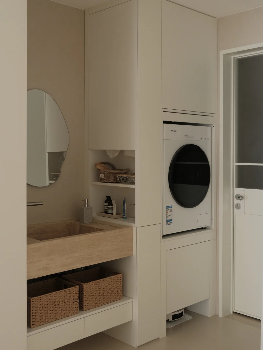 ▪️外区干区:洞石洗手台+家政收纳柜,洗漱、洗衣、收纳一站式搞定,日常打理完全不沾湿水