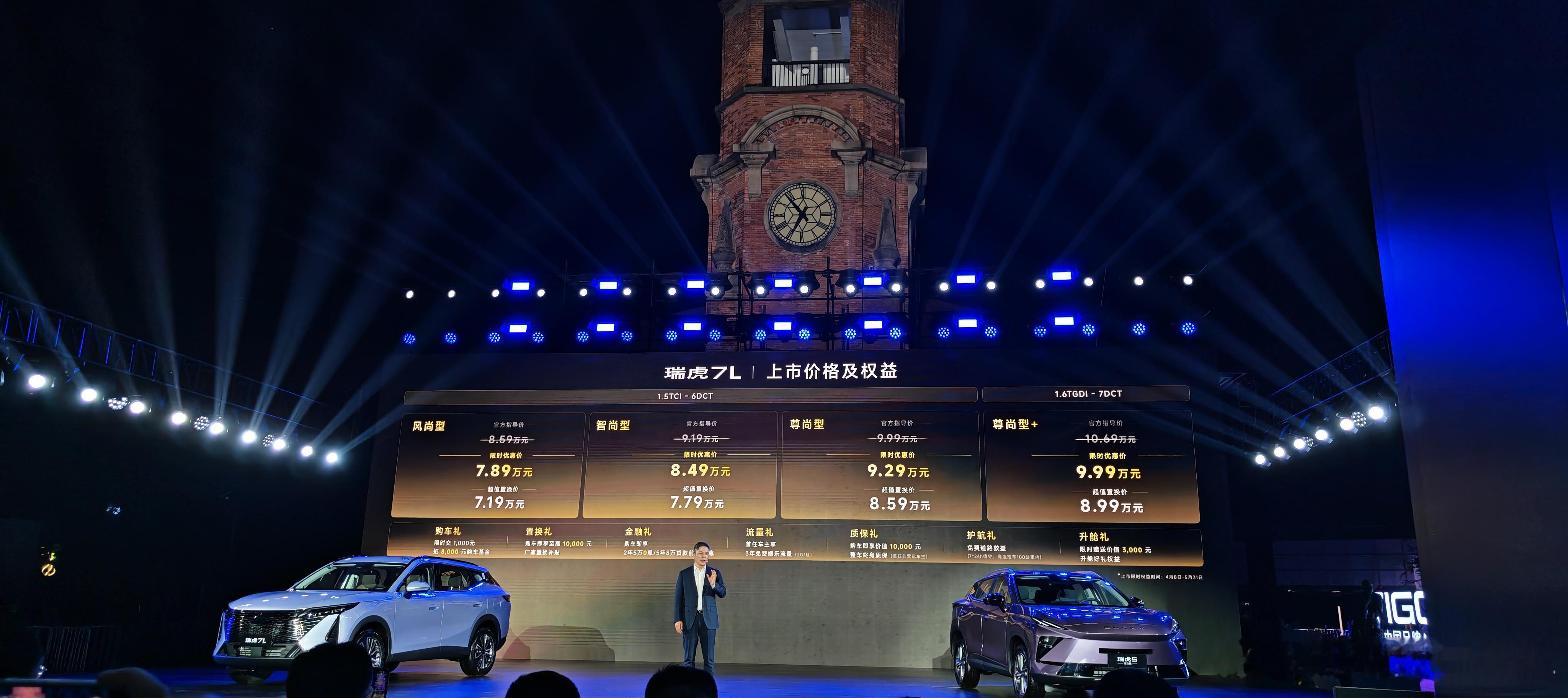 瑞虎7|瑞虎5新品全球上市发布会全球车瑞虎7L1.5TCI+6DCT 风尚版限时优惠价 7.89万元1.5TCI+6DCT 智尚版限时优惠价 8.49万元1.5TCI+6DCT 尊尚版限时优惠价 9.29万元1.6TGDI+7DCT 尊尚版+限时优惠价 9.99万元配备15.6寸滑移屏,女王副驾。同级唯一7气囊,尊尚版+搭载鲲鹏1.6T发动机。