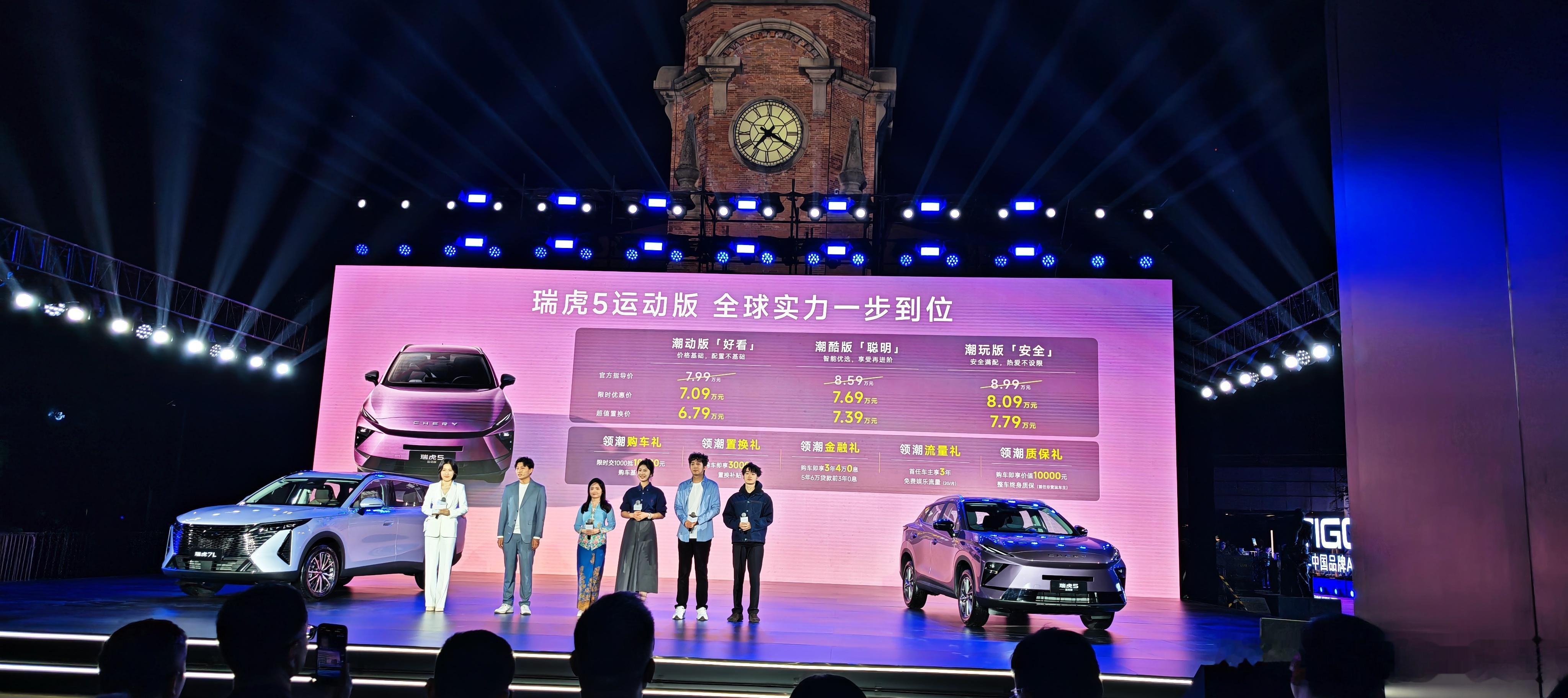 瑞虎5运动版潮动版限时优惠价 7.09万元潮酷版限时优惠价 7.69万元潮玩版限时优惠价 8.09万元搭配旋风轮毂+红色卡钳+闪电尾灯。智领座舱,同级唯一15.6寸2K中控大屏,同级独有8155芯片,同级独有AI语音大模型,配备手机蓝牙钥匙+OTA升级。同级唯一索尼8扬声器,电动尾门。6安全气囊,L2级智驾系统。