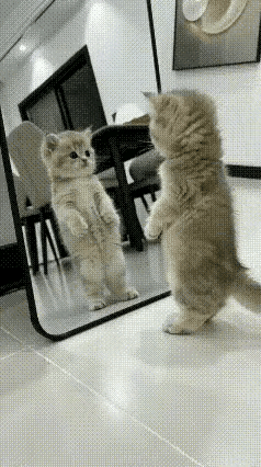 来到镜子前,猫咪会稳稳地站立起身,挺直小小的身子,一双圆溜溜的眼睛,一眨不眨地盯着镜子里的自己,眼神专注又认真,仿佛在仔细打量自己的模样。