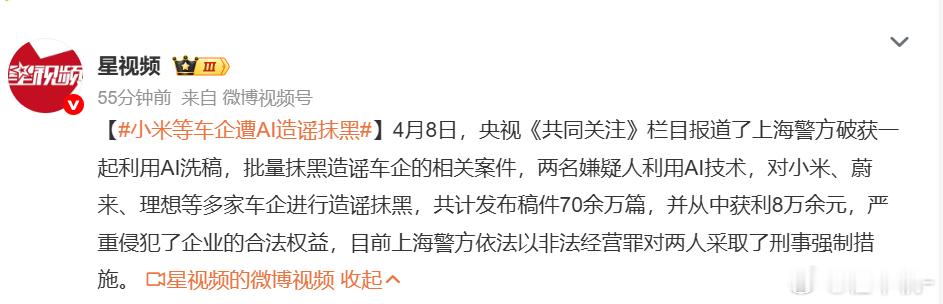 小米等车企遭AI造谣抹黑 这次黑公关团伙让人就很难绷的,两个人整了4000多个账号,七十多万篇稿子总共赚了平台八万多流量费,一时之间不知道该说什么好,但凡用心做一下账号都不止赚八万,还不用担风险