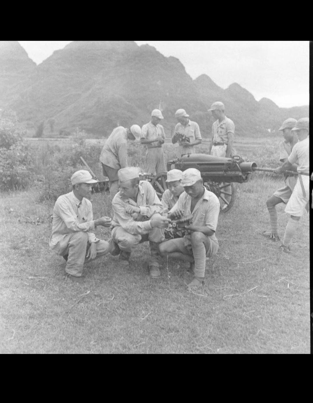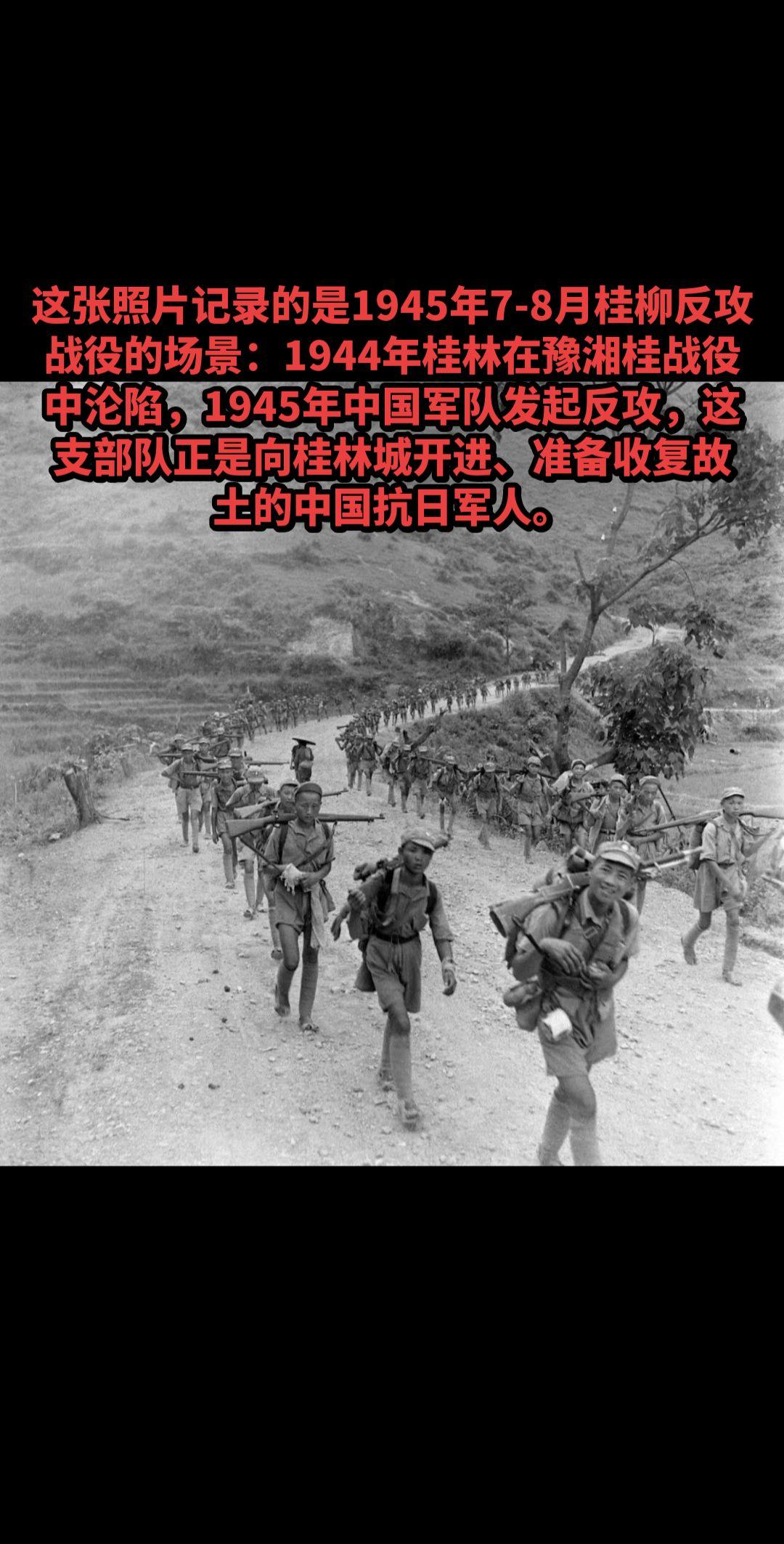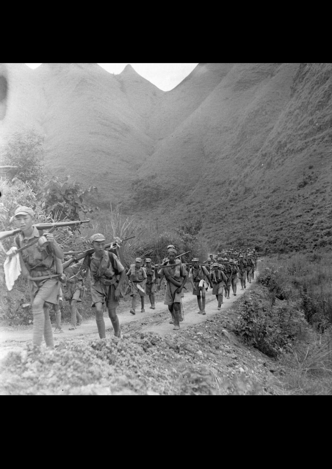 1945年7-8月桂柳反攻战役。照片由美国《生活》杂志摄影师杰克·威尔克拍摄,时间正是1945年7月桂林光复前后,地点是桂林城郊的喀斯特山区土路。照片里的士兵,正是参与桂林光复战的中国军队,他们穿着草鞋、短裤,装备简陋却士气高昂,是广西“狼兵”和反攻部队的真实写照。