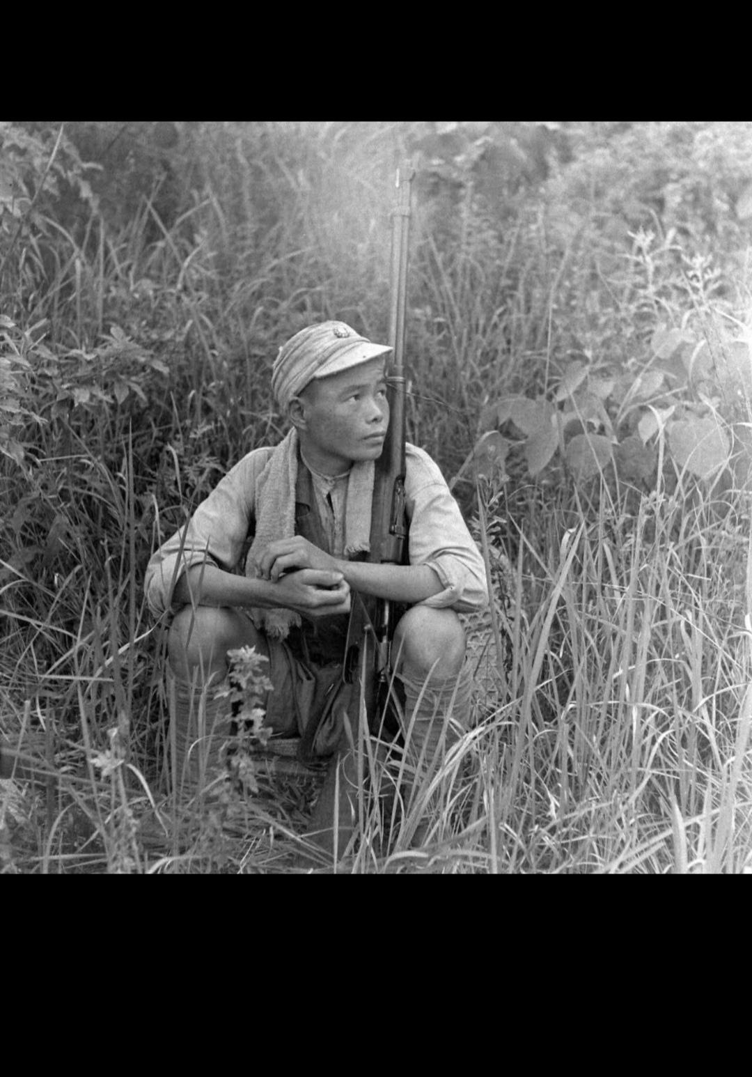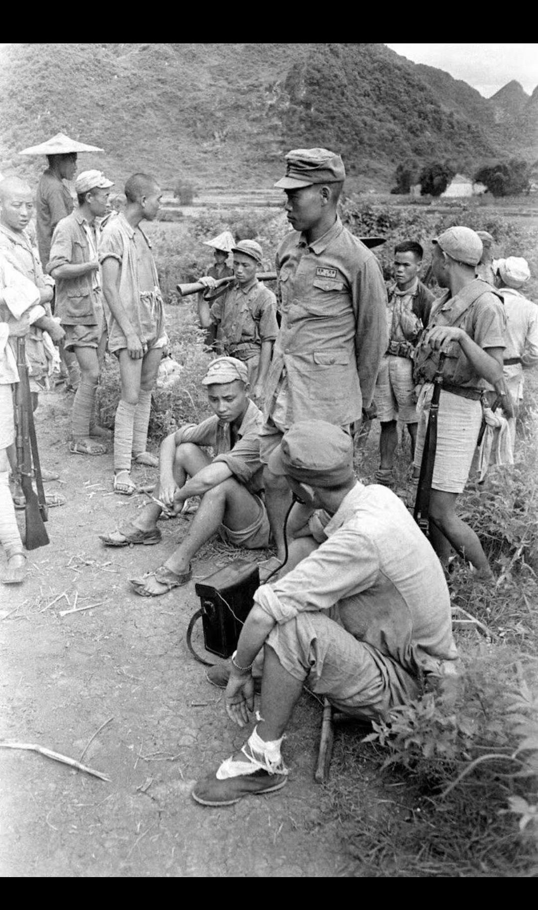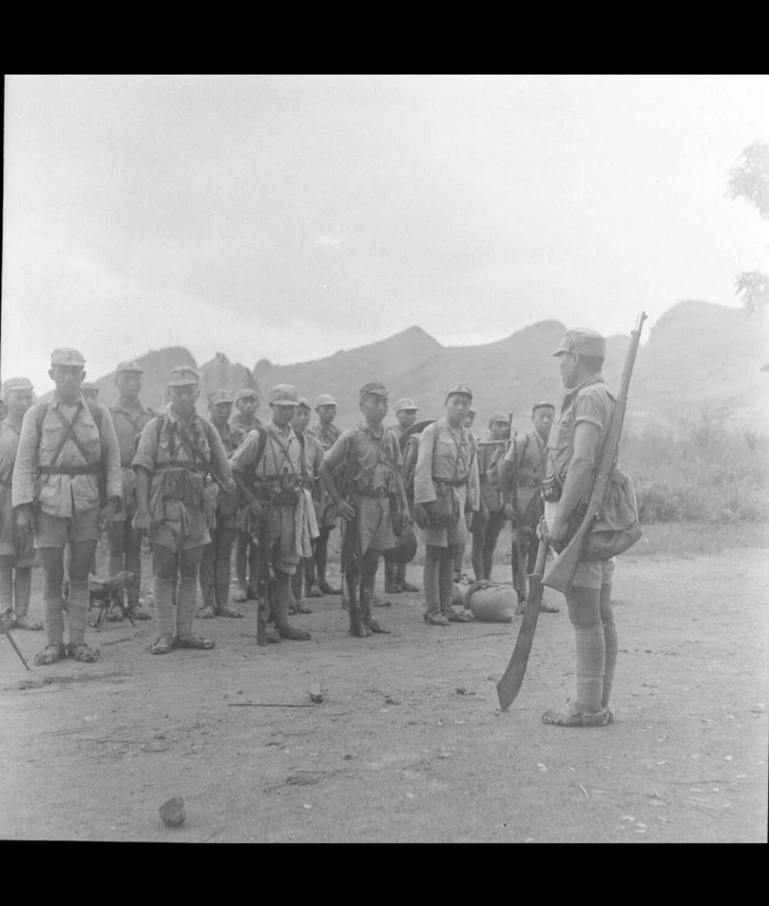1945年7-8月桂柳反攻战役。照片由美国《生活》杂志摄影师杰克·威尔克拍摄,时间正是1945年7月桂林光复前后,地点是桂林城郊的喀斯特山区土路。照片里的士兵,正是参与桂林光复战的中国军队,他们穿着草鞋、短裤,装备简陋却士气高昂,是广西“狼兵”和反攻部队的真实写照。