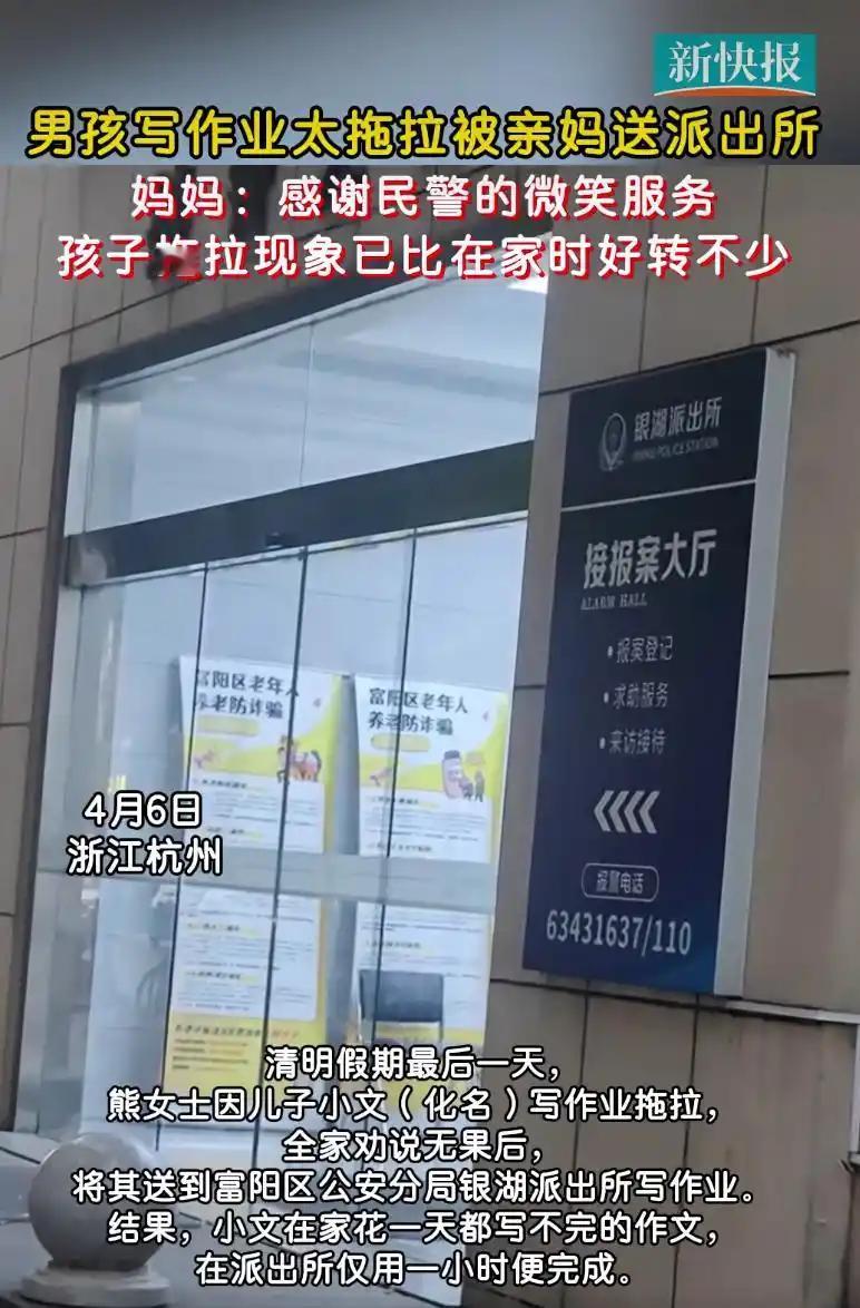 清明小长假最后一天,杭州一位熊女士的做法在网上引发了热议 —— 因为儿子小文写作业太拖拉,全家劝说半天都没用,她干脆按照事先约定,把孩子送到了富阳区公安分局银湖派出所,让民警帮忙 “监督” 写作业。没想到,小文在家磨磨蹭蹭一天都写不完的作文,在派出所里仅用一小时就顺利完成了。