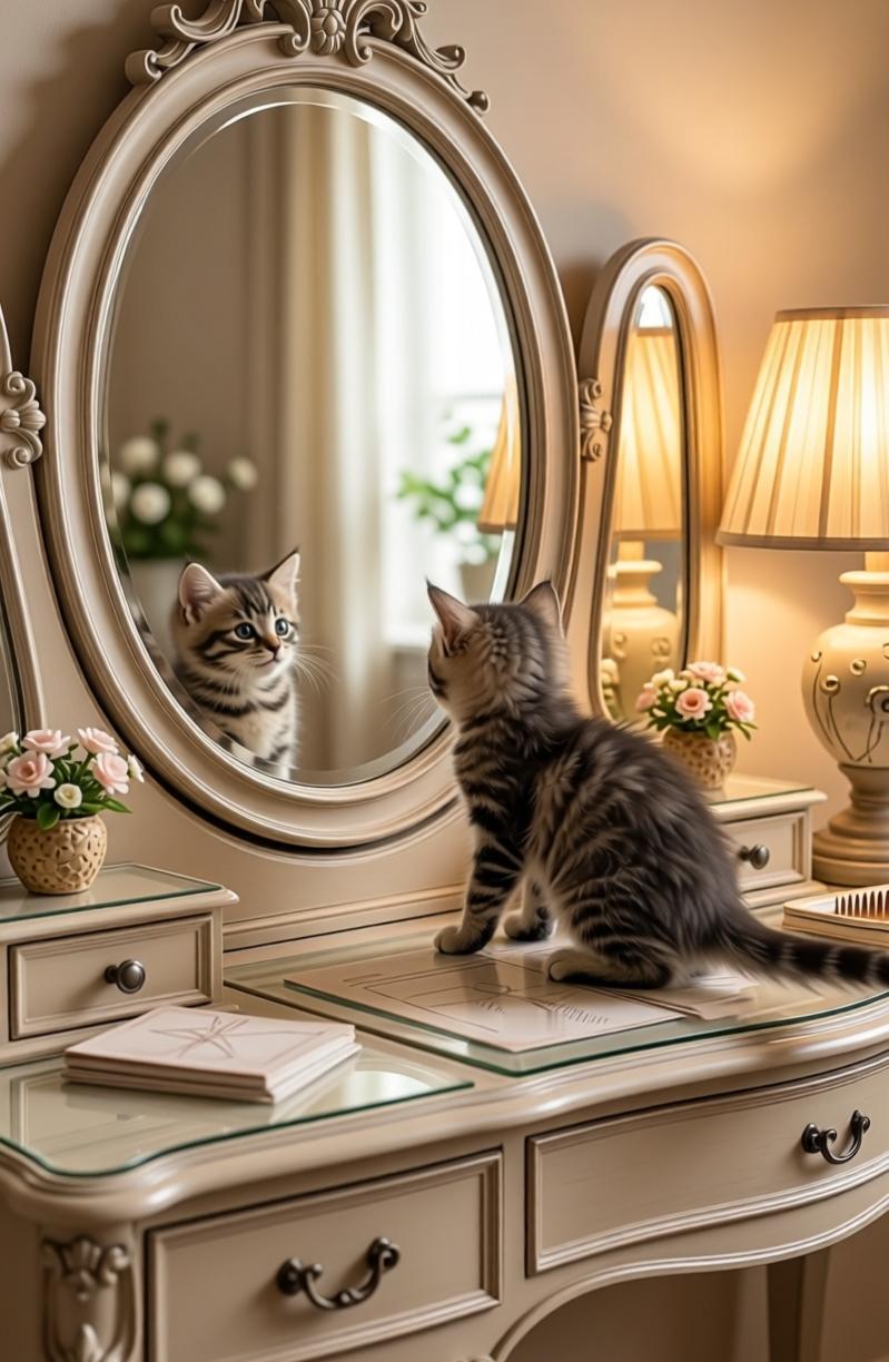 现在猫咪每天一睡醒,第一件事就是冲到镜子前。它先是站立起来,认真地盯着镜子里的自己,随后左转右转各一圈,又继续盯着镜子里的自己,那表情可萌了。