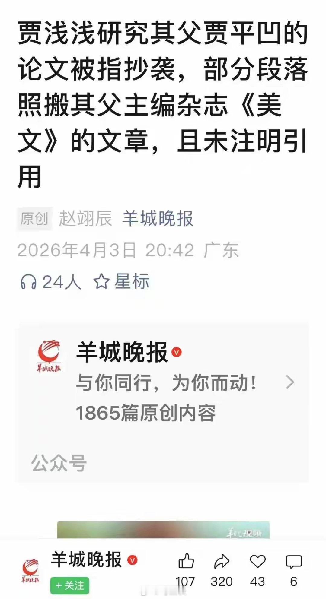 比抄袭更令人心寒的,是相关方的集体沉默。贾浅浅父女漠视舆论,妄图靠拖延淡化争议;西北大学无视教育部规定,拒不回应调查,核心原因,我猜是在于校方与贾平凹深度绑定,运营贾平凹研究中心,依托其名气维系学科地位。