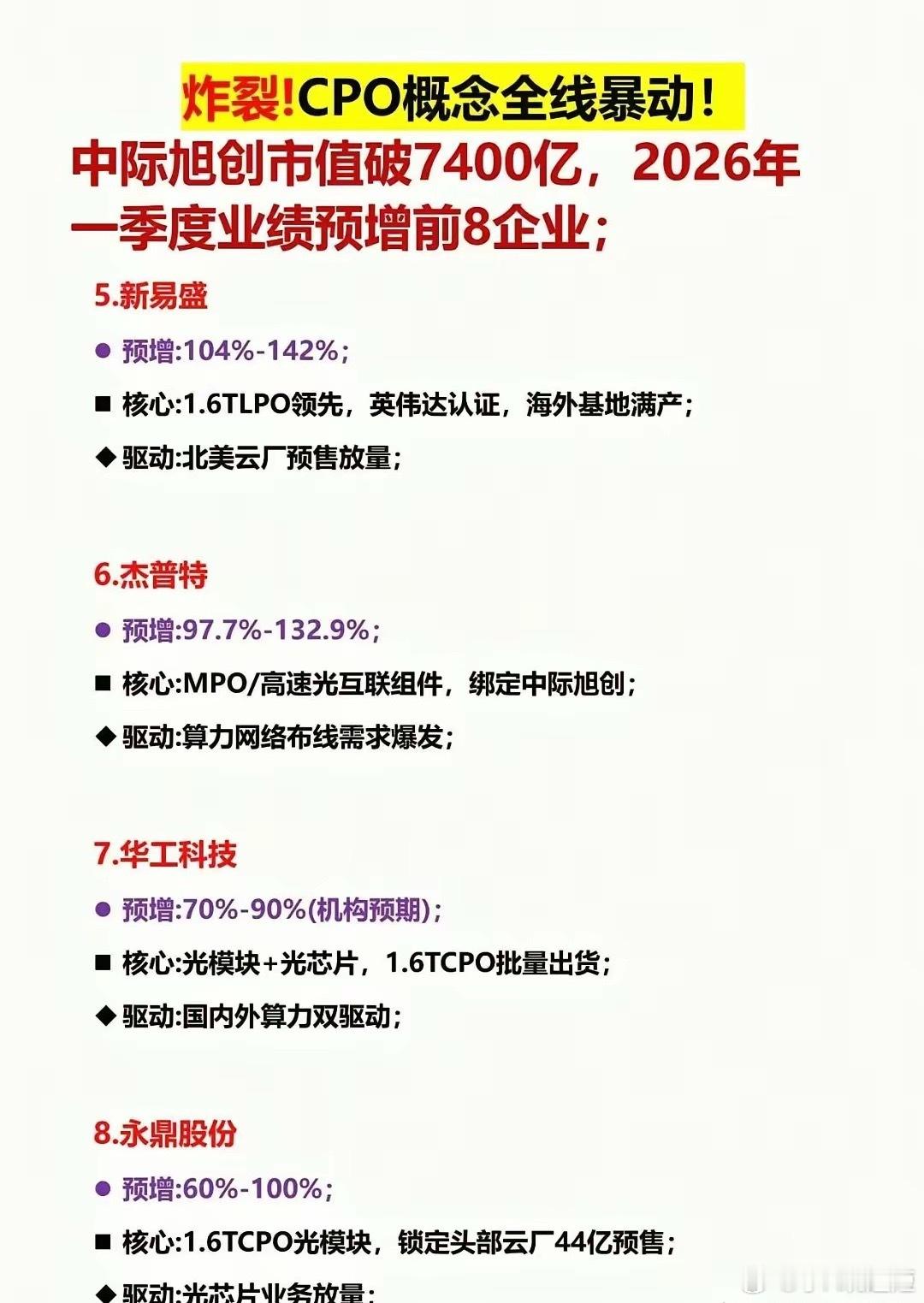 AI算力浪潮席卷全球,CPO与PCB两大算力核心赛道,业绩与逻辑双重共振,把握AI算力时代的核心投资机遇!CPO+PCB两大主线全梳理,核心标的一网打尽!PCB产业链迎来涨价潮+龙头扩产双重催化!日本三菱瓦斯化学宣布电子材料全面涨价30%,国内头部企业新增高端产能投资超400亿,AI服务器PCB成为行业最确定增长方向。胜宏科技作为全球AI服务器PCB绝对龙头,深度绑定英伟达;沪电股份、深南电路等高端PCB龙头持续突破,上游覆铜板、电子布、设备等环节同步受益,产业链全链条迎来爆发。风险提示:AI算力浪潮下,CPO、PCB两大主线持续火爆,股价与业绩双双冲高,当前板块内龙头股普遍处于历史估值高位,中际旭创、天孚通信等标的市盈率已远超行业平均水平,股价提前透支了未来2-3年的业绩增长预期。但越是狂欢时刻,越要绷紧风险这根弦!⚠️ 以上内容仅为风险提示,不构成任何投资建议,理财有风险,投资需谨慎。