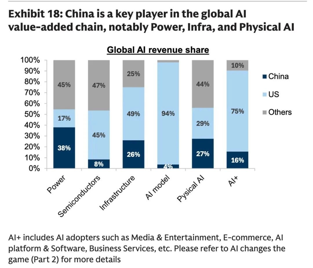 这是高盛统计的。中国在AI电力上收入全球占比最高,有38%。这不是说卖电力,而是建设电力需要的供应链中国占优。