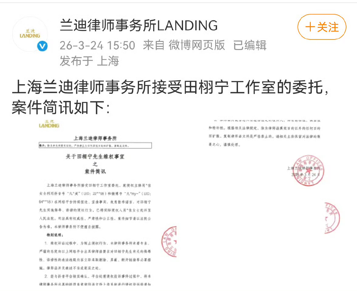 田栩宁名誉维权最新进展 告源头的含金量,大律所有章的含金量