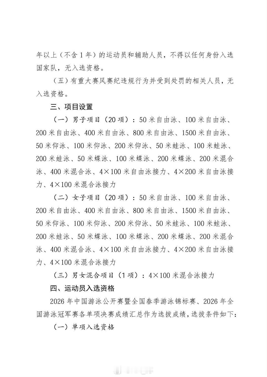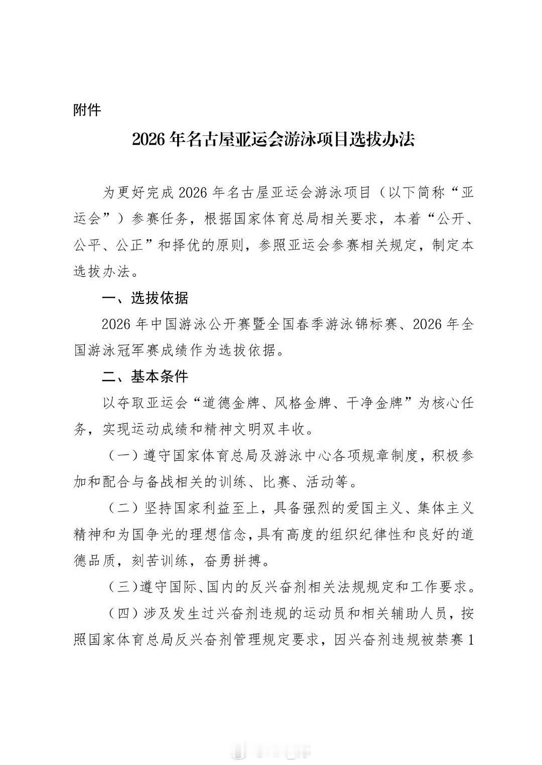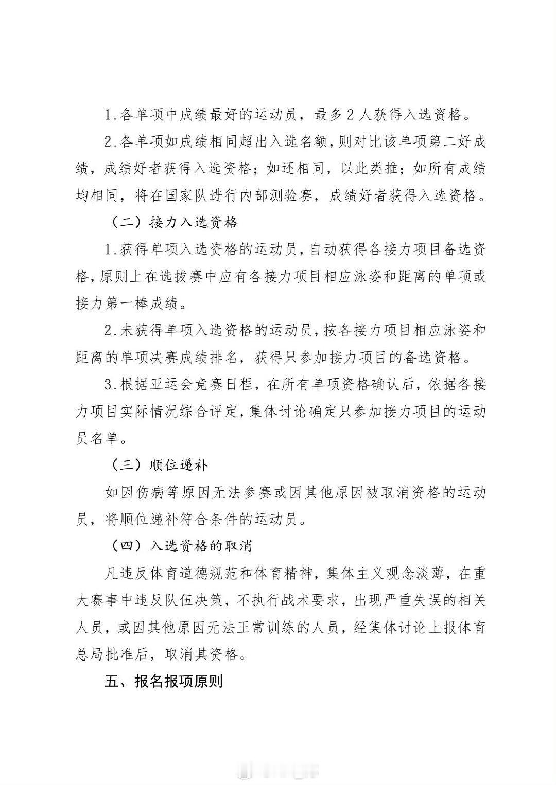 游泳 亚运会游泳🏊♂️项目选拔办法公示 ⭐️2026年中国游泳公开赛、2026年全国游泳冠军赛成绩作为选拔依据⭐️单项入选资格1️⃣各单项中成绩最好的运动员,最多2人获得入选资格。2️⃣各单项如成绩相同超出入选名额,则对比该单项第二好成绩,成绩好者获得入选资格;如还相同,以此类推;如所有成绩均相同,将在国家队进行内部测验赛,成绩好者获得入选资格。⭐️接力入选资格1️⃣获得单项入选资格的运动员,自动获得各接力项目备选资格,原则上在选拔赛中应有各接力项目相应泳姿和距离的单项或接力第一棒成绩。2️⃣未获得单项入选资格的运动员,按各接力项目相应泳姿和距离的单项决赛成绩排名,获得只参加接力项目的备选资格。3️⃣根据亚运会竞赛日程,在所有单项资格确认后,依据各接力项目实际情况综合评定,集体讨论确定只参加接力项目的运动员名单。