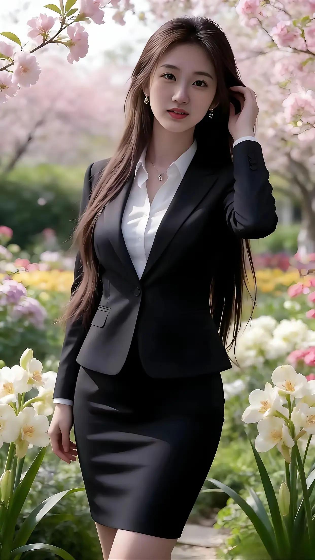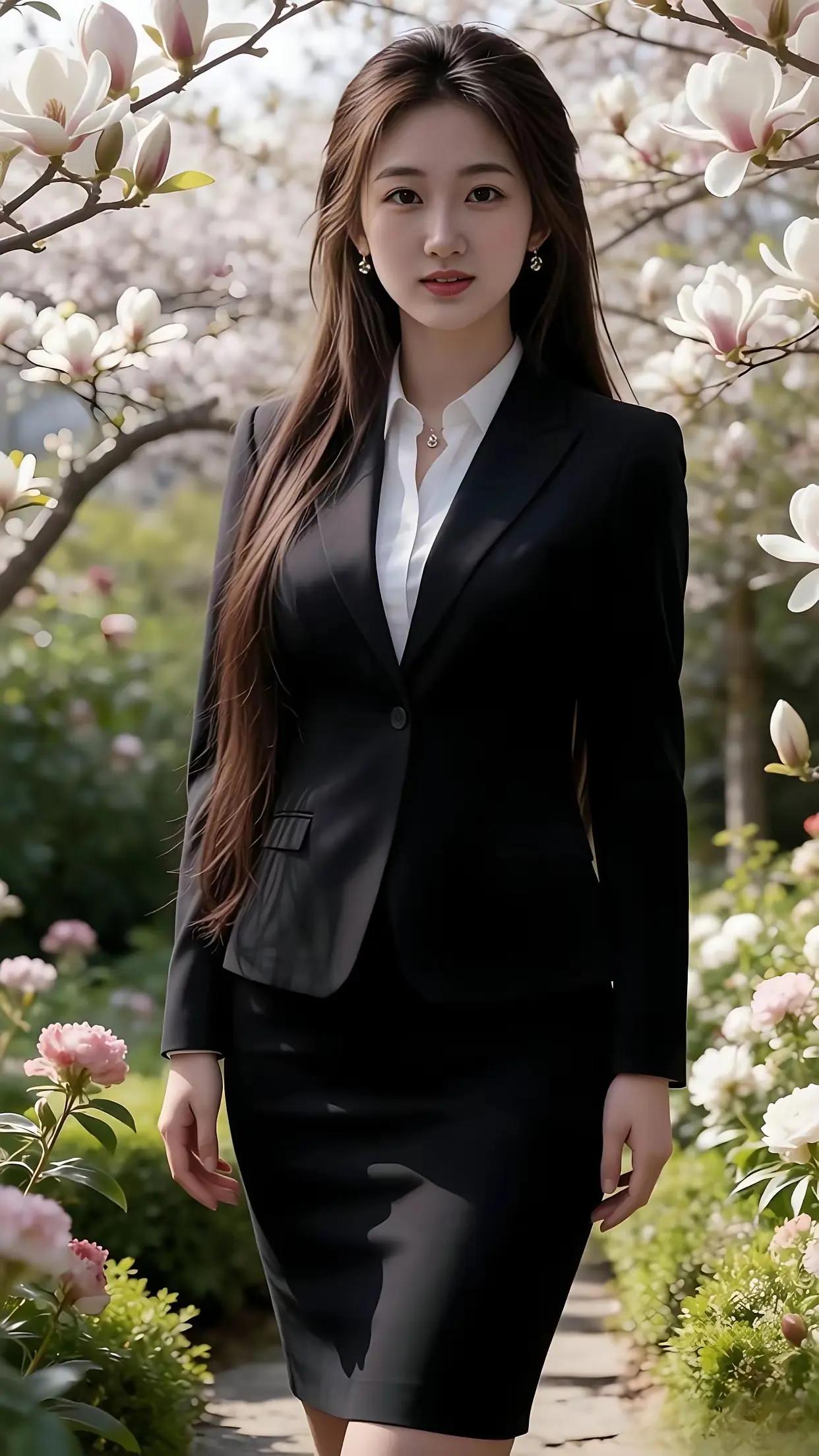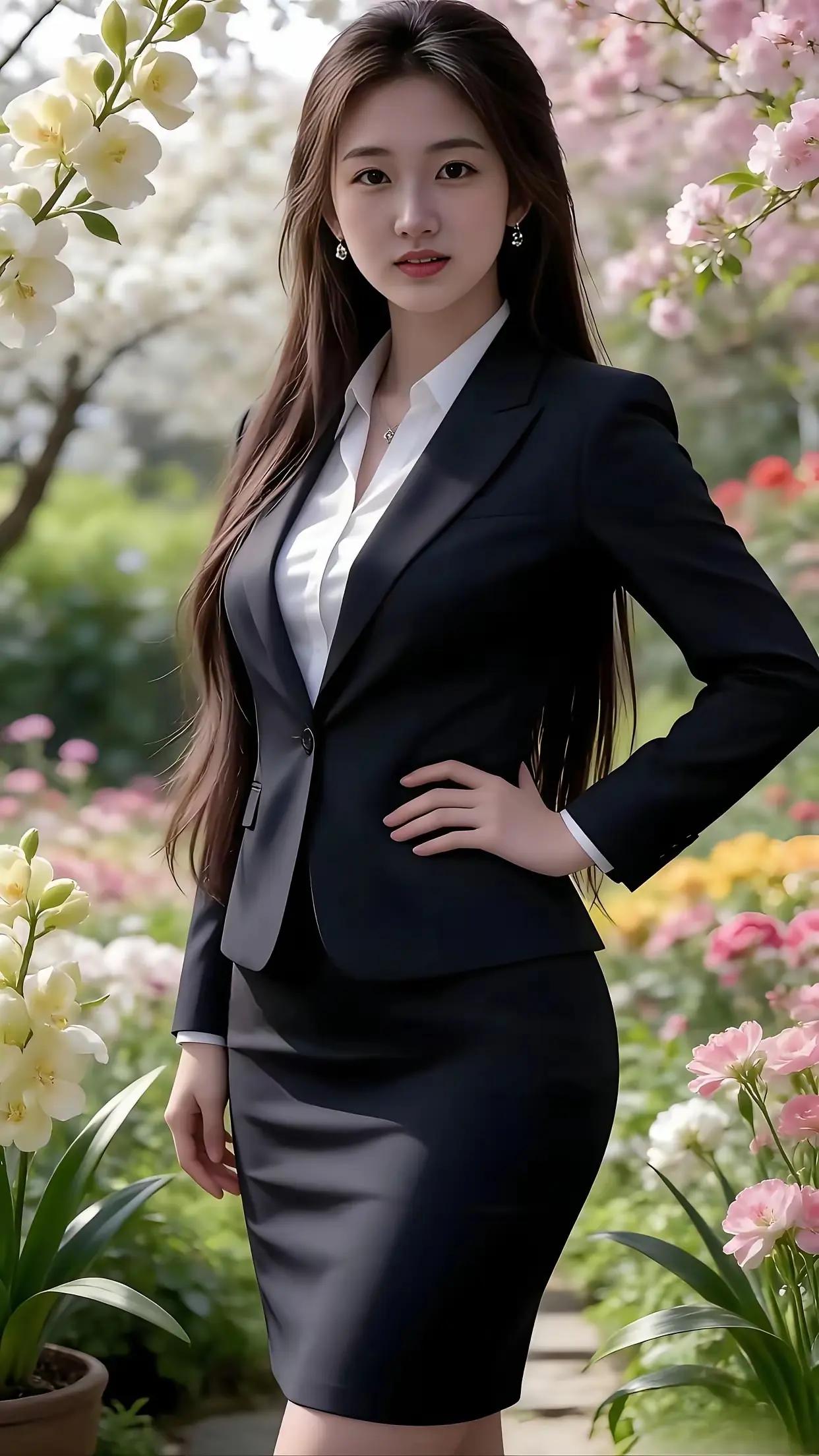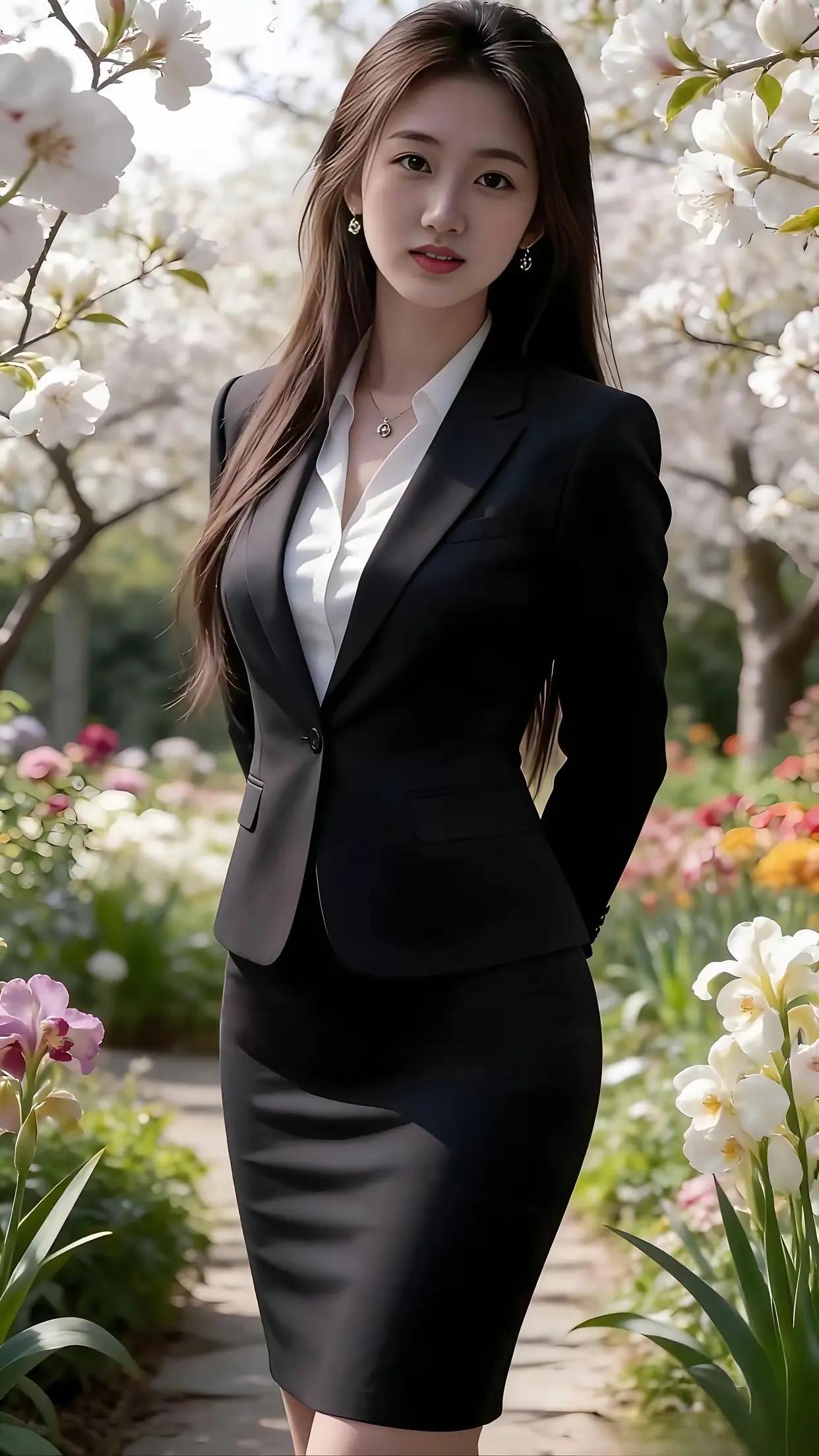 这位小姐姐在花丛中穿着黑色西装外套搭配白衬衫职业装,好有气质!