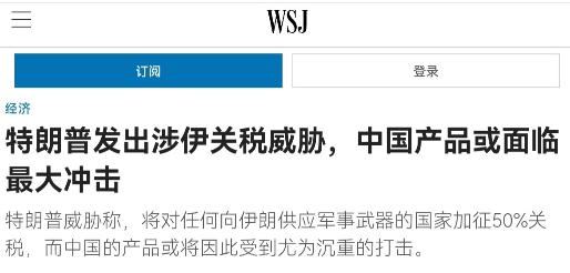 美媒警告称,中国有麻烦了!4月9日,美国华尔街日报刊文表示,特朗普威胁称,将对任何向伊朗供应军事武器的国家加征50%关税,而中国的产品或将因此受到尤为沉重的打击。如果美国总统特朗普将与向伊朗提供武器相关的关税威胁付诸实施,从中国进口的商品可能面临新关税。