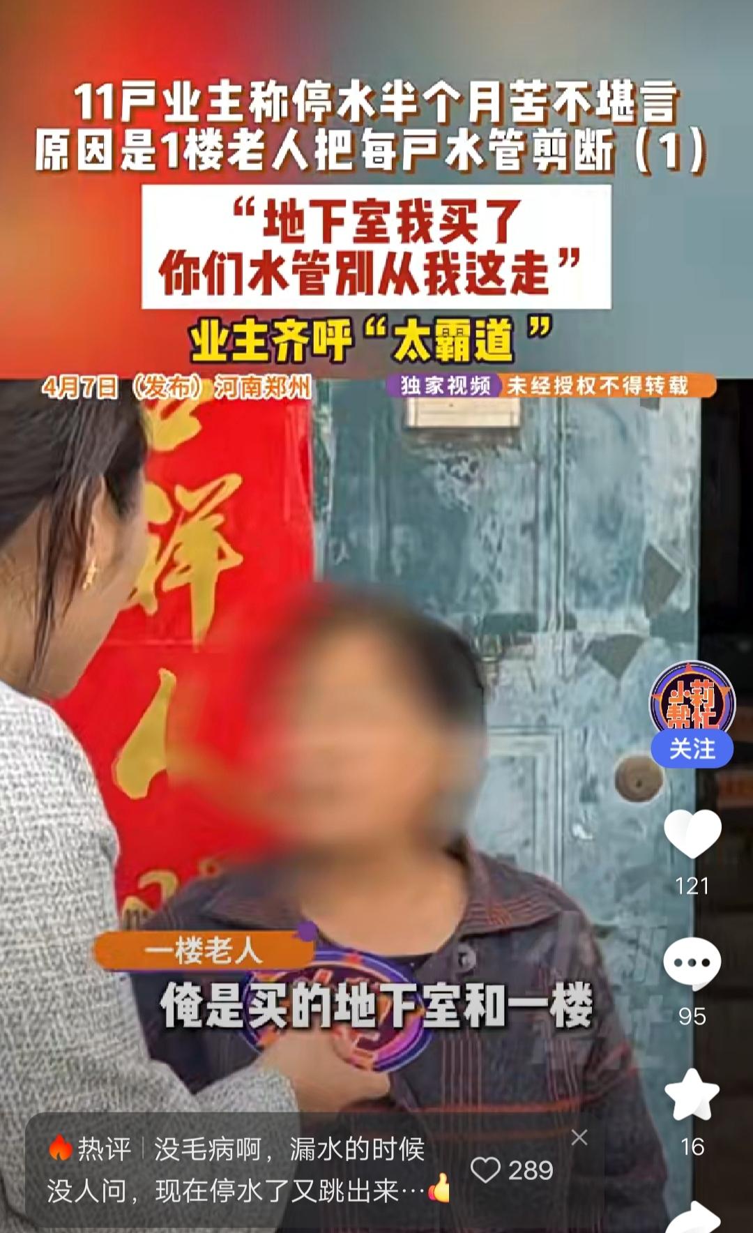 河南郑州,11户业主说停水半个月,是因一楼老太太把每户水管剪断,老太太气呼呼的说:是我剪的,楼上水管从我家地下室过,漏水没人管,才出此下策,业主们十分崩溃,说维修钱都给老太太了,还说老太太不让从楼梯间过,在楼前停车,老太太还收费,村委表示:水管从楼梯间上去,老太太非说楼梯也是她的。最后结局让人无奈。
