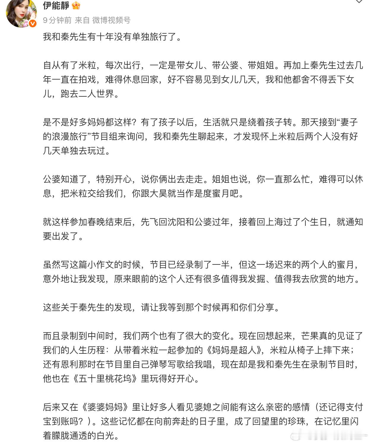 伊能静新综艺开播长文伊能静千字长文谈新节目 看完长文最大的感受:伊能静是真的在认真经营婚姻和人生。十年没单独旅行不重要,重要的是他们还愿意为彼此创造机会。这综艺必须追!