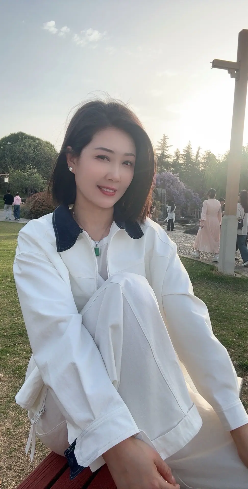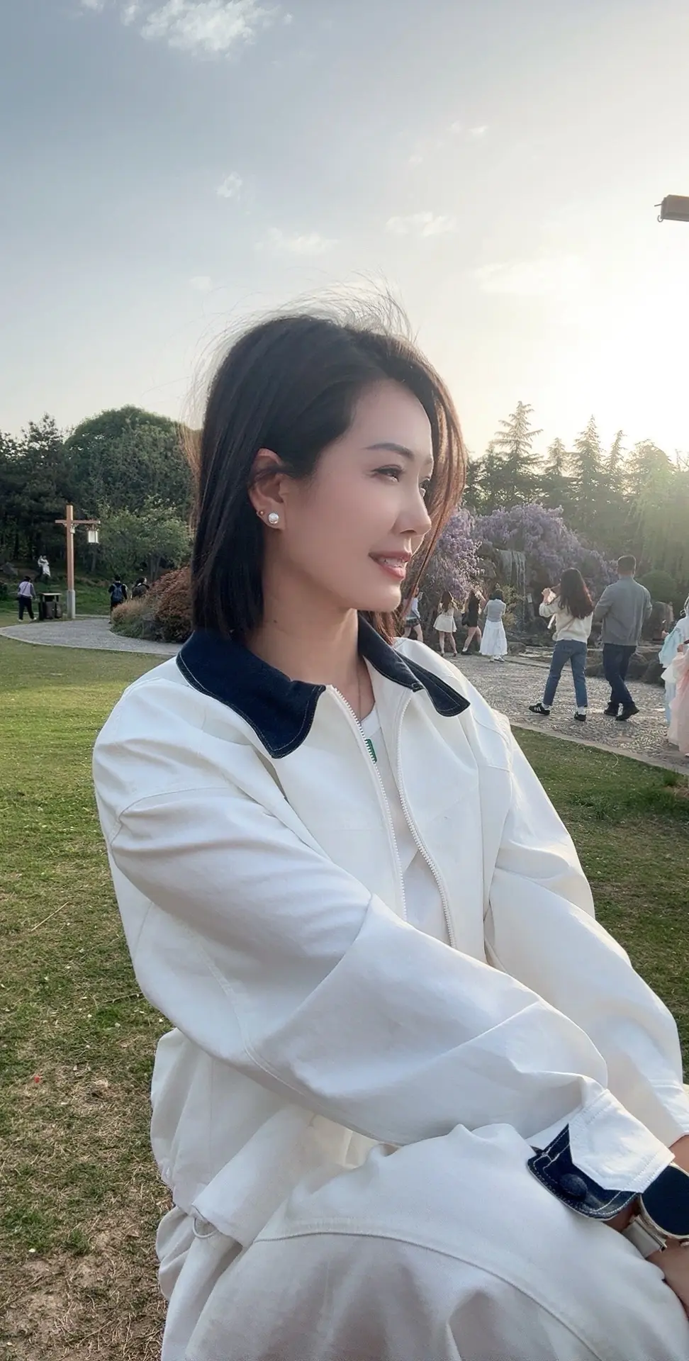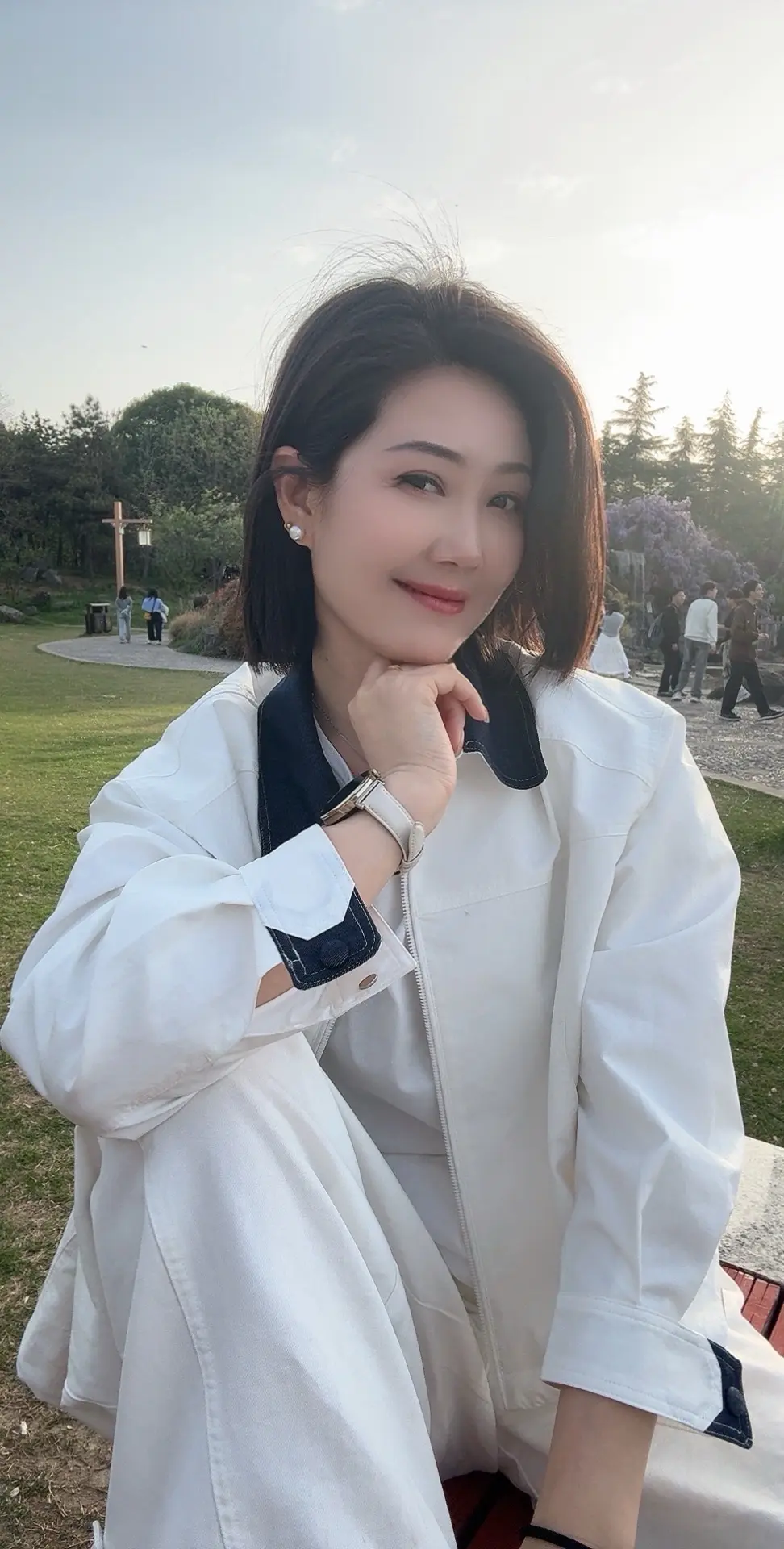 这位小姐姐在花丛中穿着黑色西装外套搭配白衬衫职业装,好有气质!