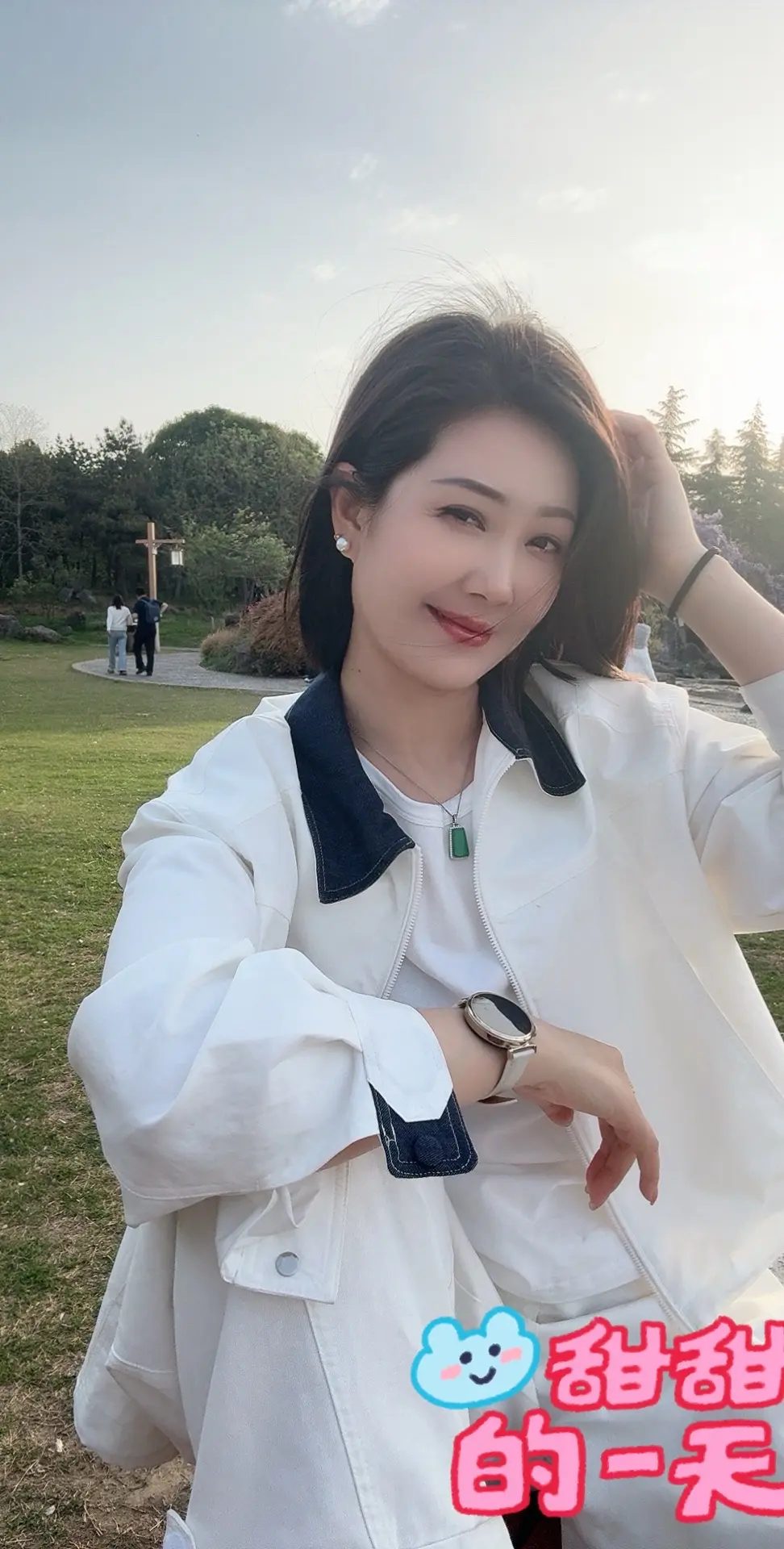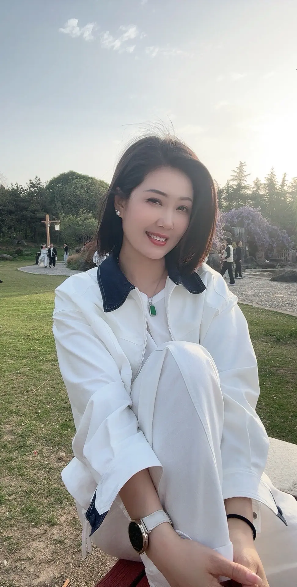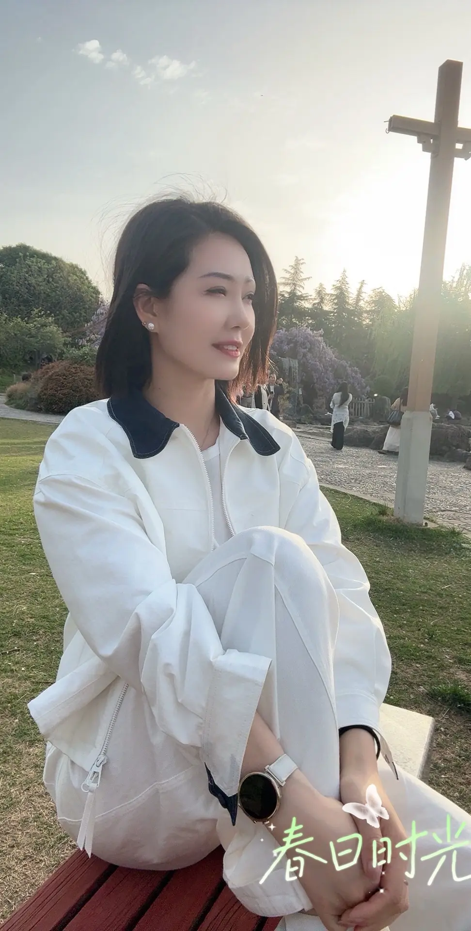 这位小姐姐在花丛中穿着黑色西装外套搭配白衬衫职业装,好有气质!