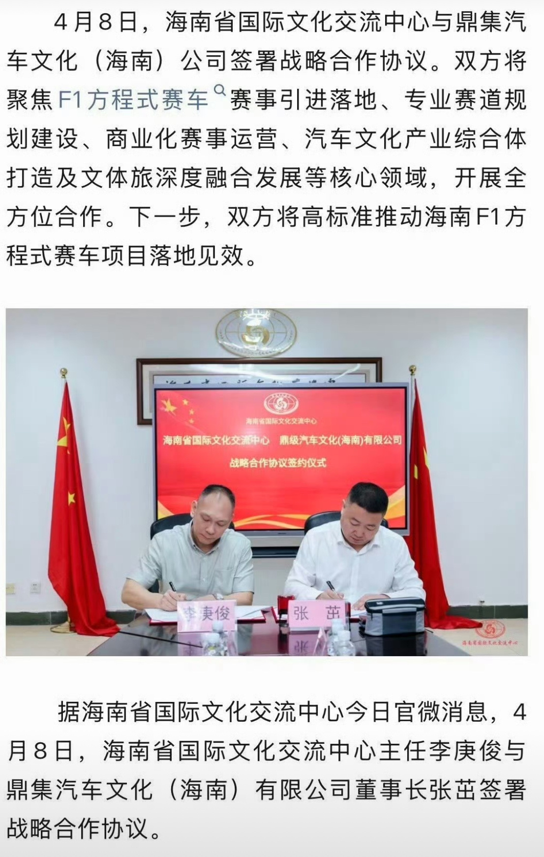 此次签约仪式上,海南省国际文化交流中心主任李庚俊与鼎集汽车文化(海南)有限公司董事长张茁共同签署协议,标志着海南F1项目从规划阶段正式迈入实操落地阶段。根据合作内容,双方将围绕F1赛事落地、赛道建设、商业运营、文旅融合等多个核心领域展开全方位深度合作,目标是将海南打造成为中国高端汽车文化产业的全新名片,让世界顶级赛车赛事正式落户中国海南!