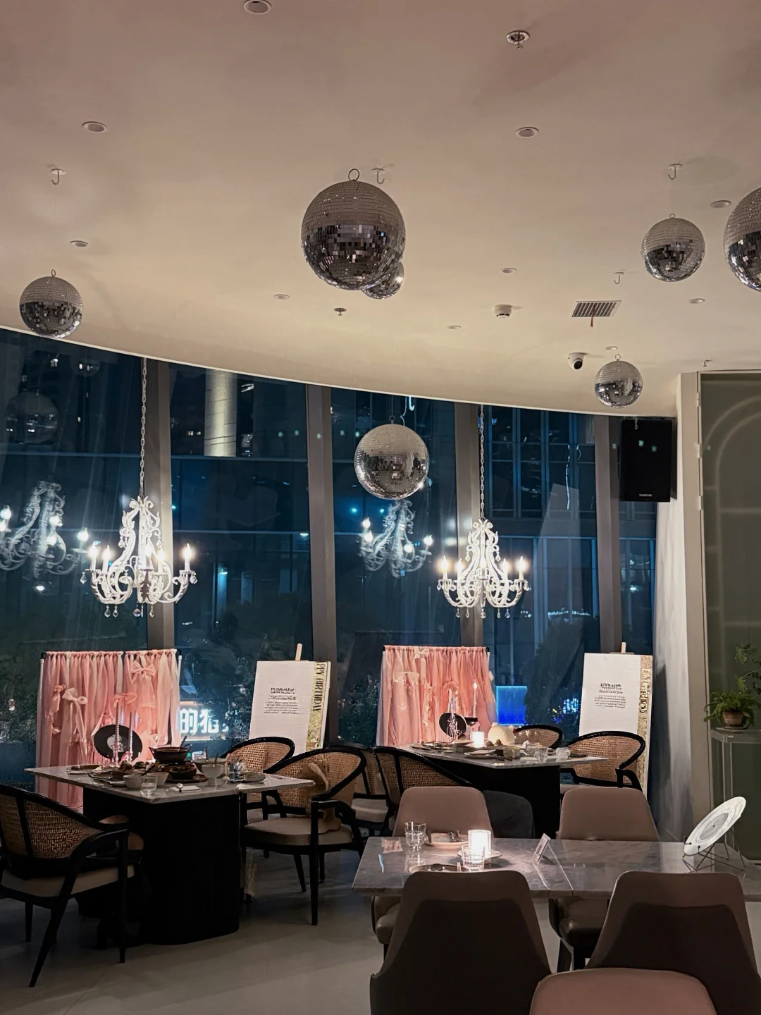 这家餐厅真的太懂女生了!超大落地窗把城市夜景框成一幅画,水晶吊灯+迪斯科球的组合,复古又精致,随便拍都是氛围感大片📸