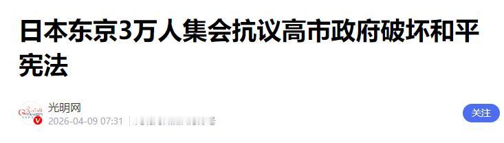 4月8日晚,东京国会议事堂前聚集了约3万名抗议者,他们高举标语,呼喊口号,“高市政权即刻下台”“守护和平宪法”“不要战争”,民众的愤怒如同汹涌的潮水,席卷首都,也同时在全国130多个城市和乡镇扩散开来。