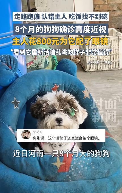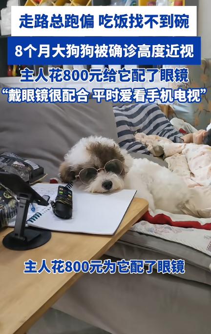 (信息来源:封面新闻《走路跑偏、吃饭找不到碗,8个月的狗狗确诊高度近视主人花800元为它配了眼镜》)