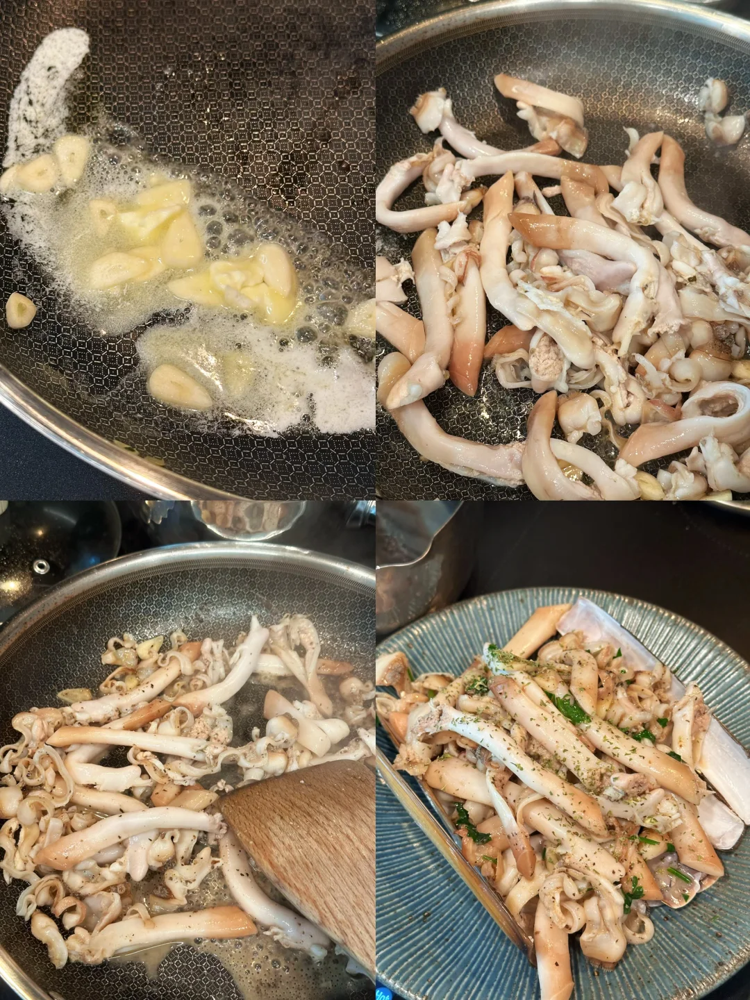 黄油爆香蒜片好香,白葡萄酒淋到热锅里好香,炒得刚刚好的刀蚬和松露酱与欧芹翻炒也香,制作过程充满了期待和幸福~