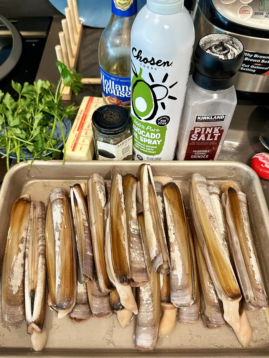 刀蚬一捆(法拉盛中超一直有,hmart要看情况),黄油1tbsp,蒜3-4瓣,白葡萄酒适量,黑松露酱2tbsp,盐少许,欧芹一把,黑胡椒少许。
