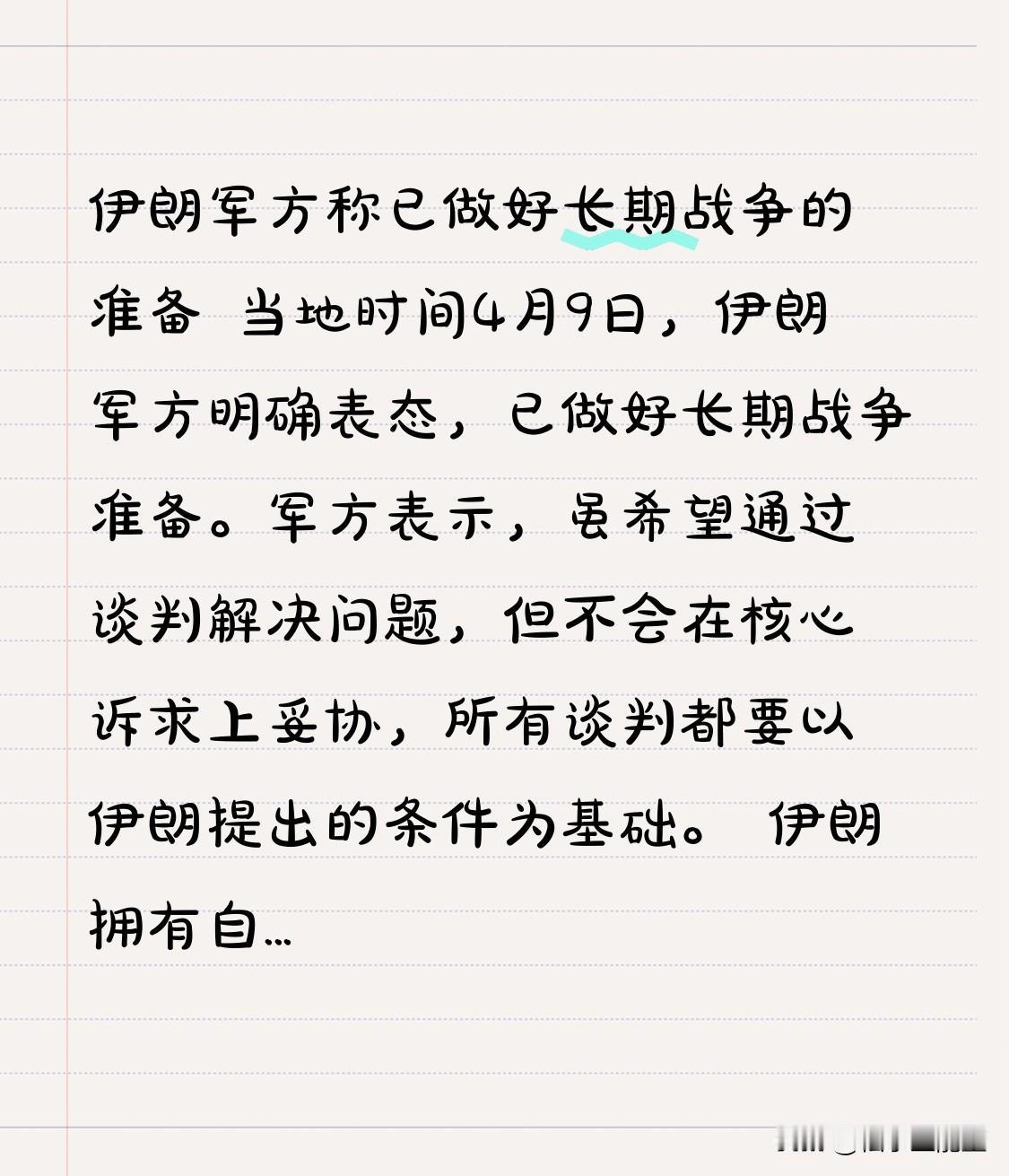 当地时间4月9日,伊朗军方明确表态,已做好长期战争准备。军方表示,虽希望通过谈判解决问题,但不会在核心诉求上妥协,所有谈判都要以伊朗提出的条件为基础。