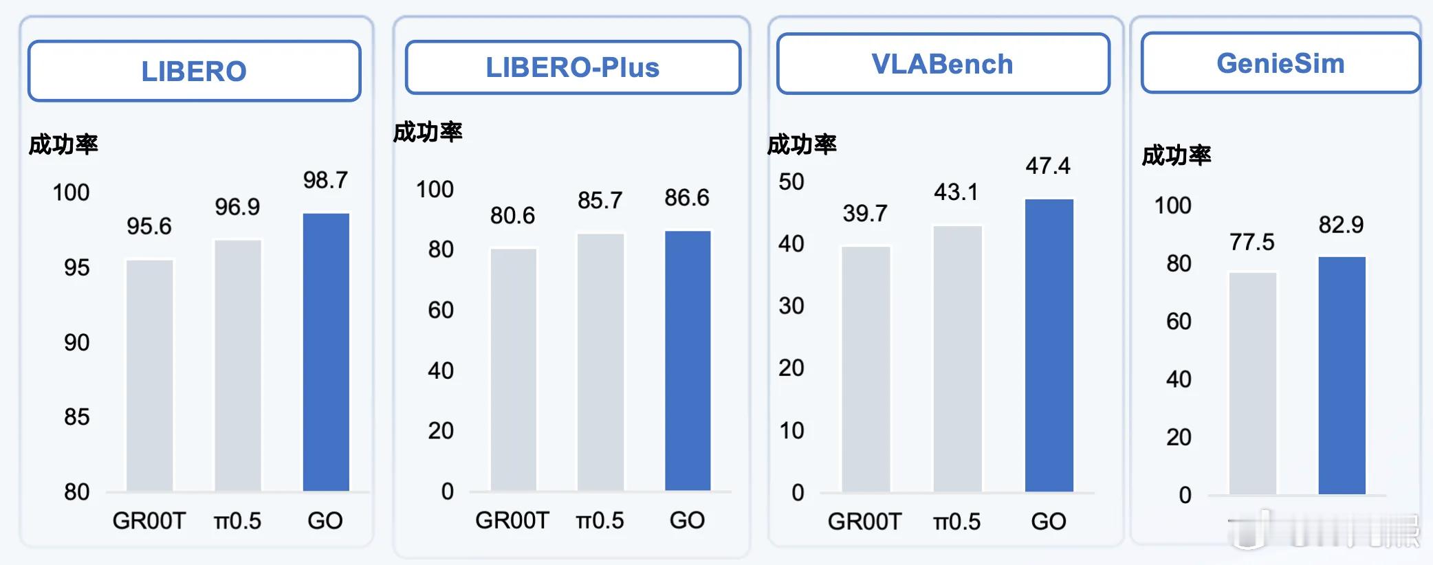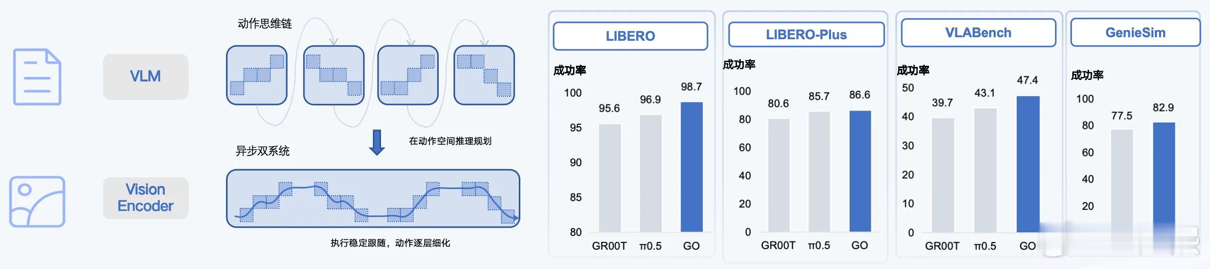 这次GO-2最关键的就是补上了“语义-动作”的断层,搞出了“动作思维链”,不是直接从指令蹦到动作,而是先在脑子里过一遍粗动作趋势,再细化到每一步精准控制 。再加上异步双系统,一边稳大局规划,一边灵活应对小扰动,就算规划有点小偏差,执行时也能稳住不崩。测试数据显示,几个基准测试全是SOTA,平均成功率快到99%,就算换环境、变光照、加干扰,零样本成功率也有86.6%。对比英伟达、π0.5这些主流模型,不管是仿真还是真机迁移,都明显更稳。核心就是以前“想”和“做”分家,现在GO-2把这俩打通了,才算真正做到“知行合一”。不只是实验室里好看,还能通过Genie Studio持续学真实数据,越用越稳。这一步,比单纯堆算力、堆参数实在多了。智元机器人