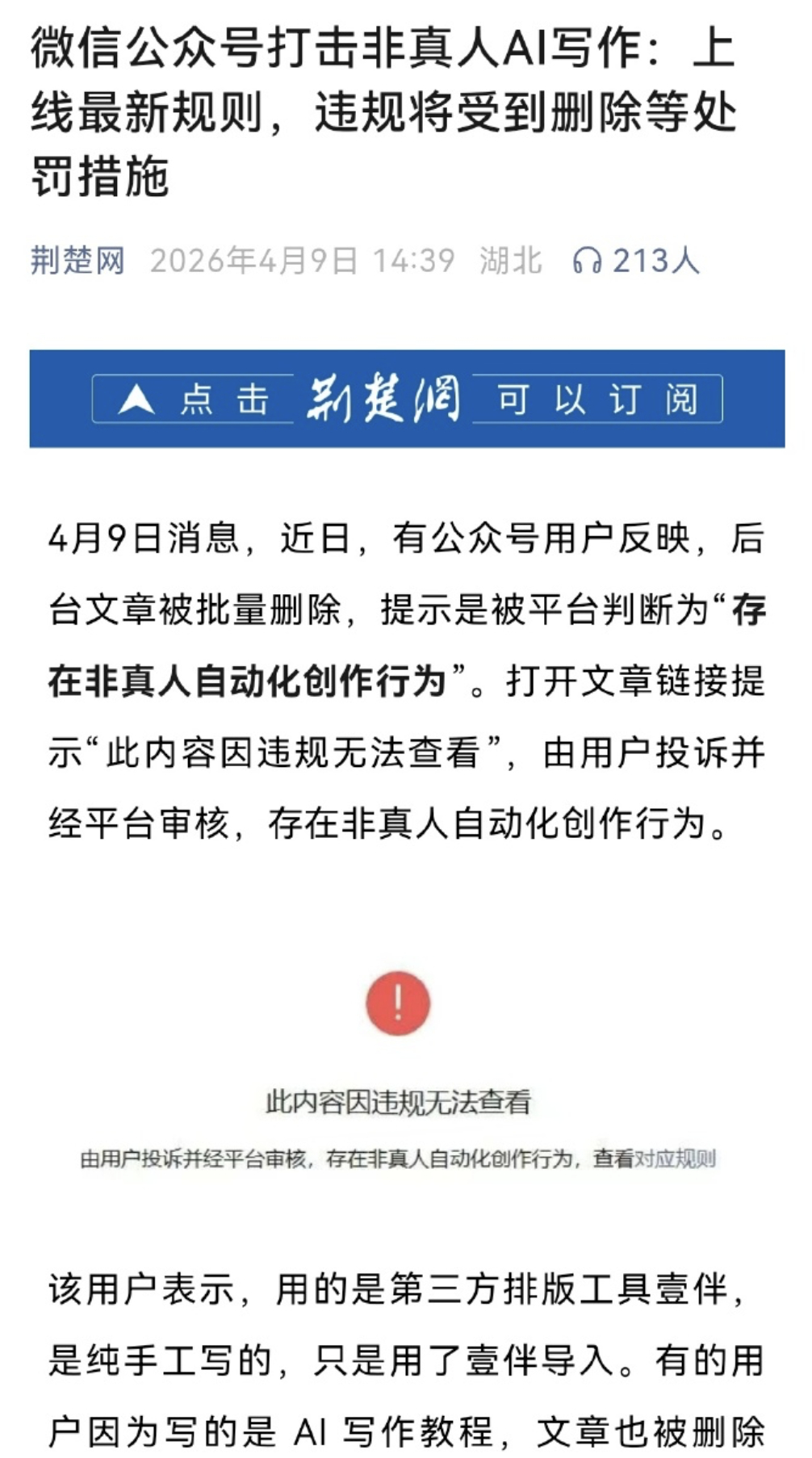 “AI写公众号年赚200万”的号被封了,程前给他宣传完动静闹的太大了公众号批量删除AI写作文章微信回应公众号批量删除AI文章