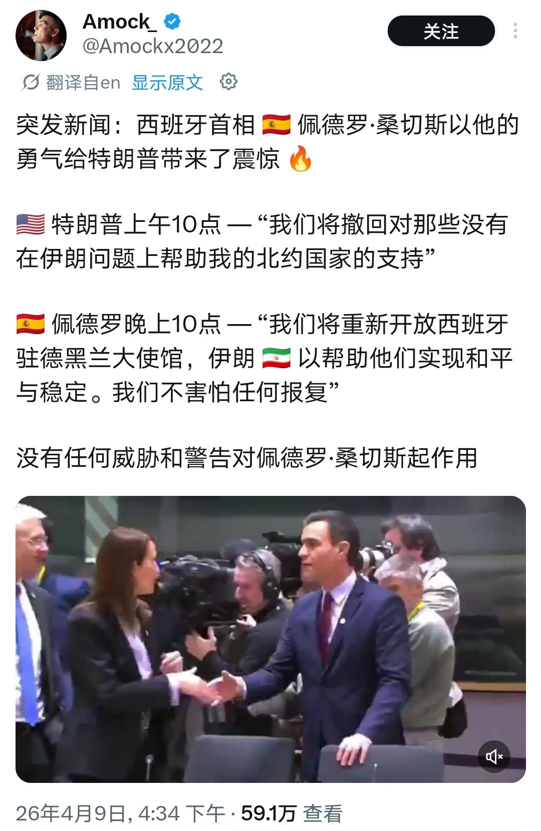 根本不鸟特朗普 “撤回对不帮美北约国家的支持” 的威胁,官宣重新开放西班牙驻伊朗大使馆,大使即刻返岗,摆明了要在美伊之间斡旋,绝不跟着美国的反伊战车走。更狠的是,西班牙早已对美以军机关闭领空,直接断了美国借道打击伊朗的后路。