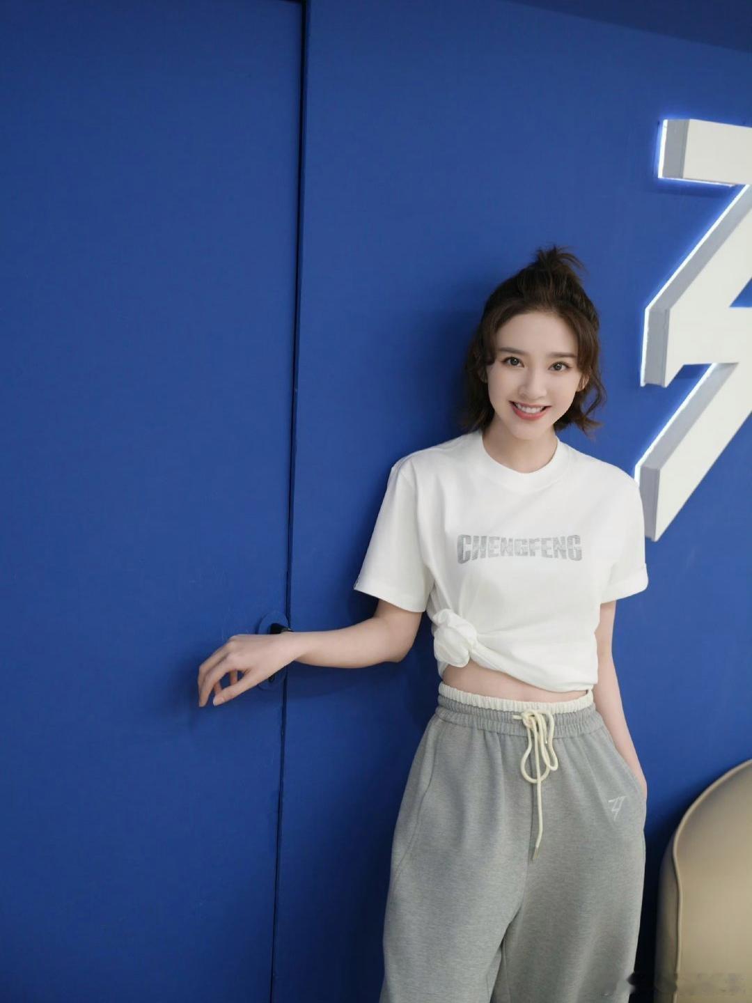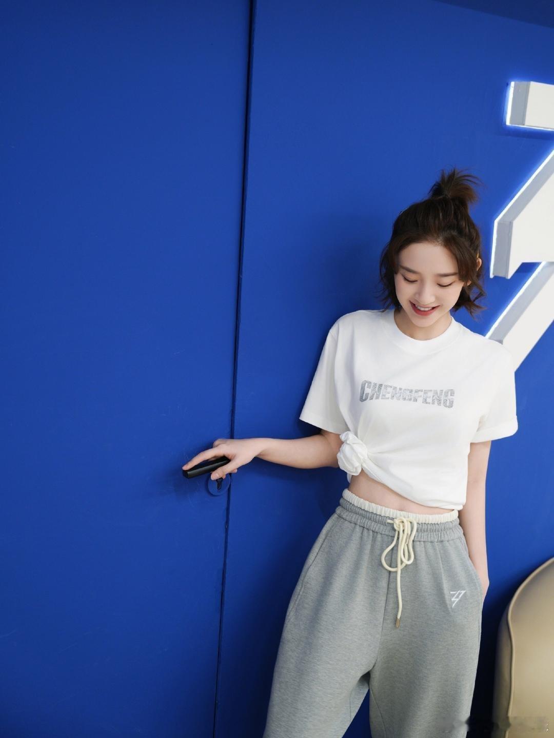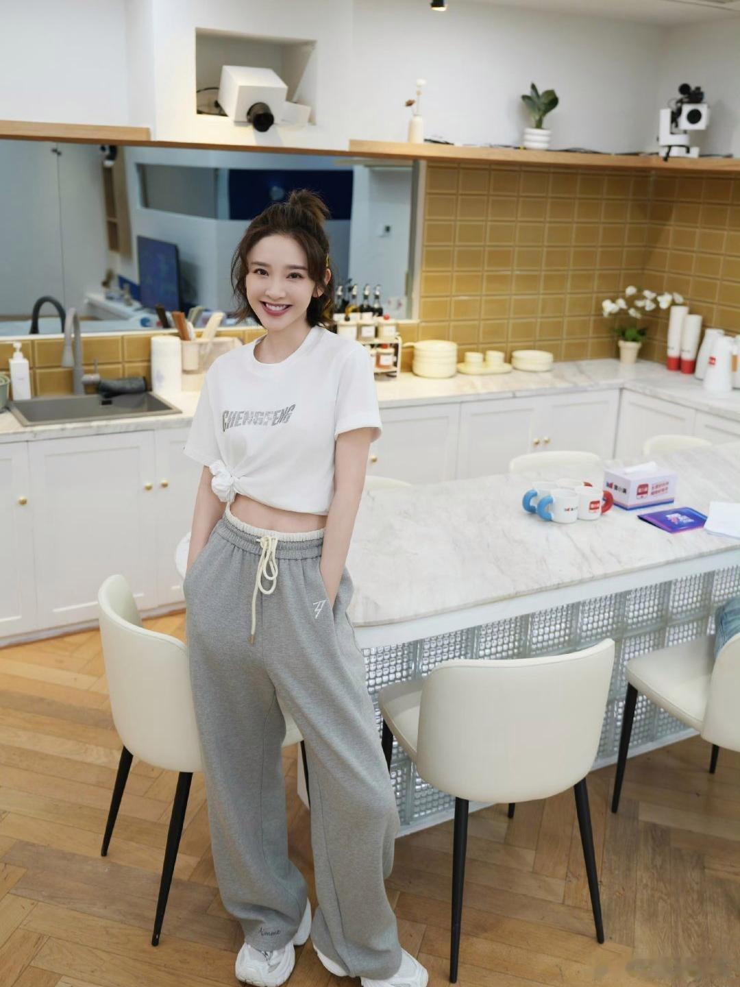 唐艺昕白T恤侧边打个结,悄悄露腰线,比例超好。搭条灰色阔腿卫裤,慵懒又舒服。丸子头清爽,小白鞋百搭。看着随意但超减龄,日常出门直接抄作业,少女感轻松拉满。